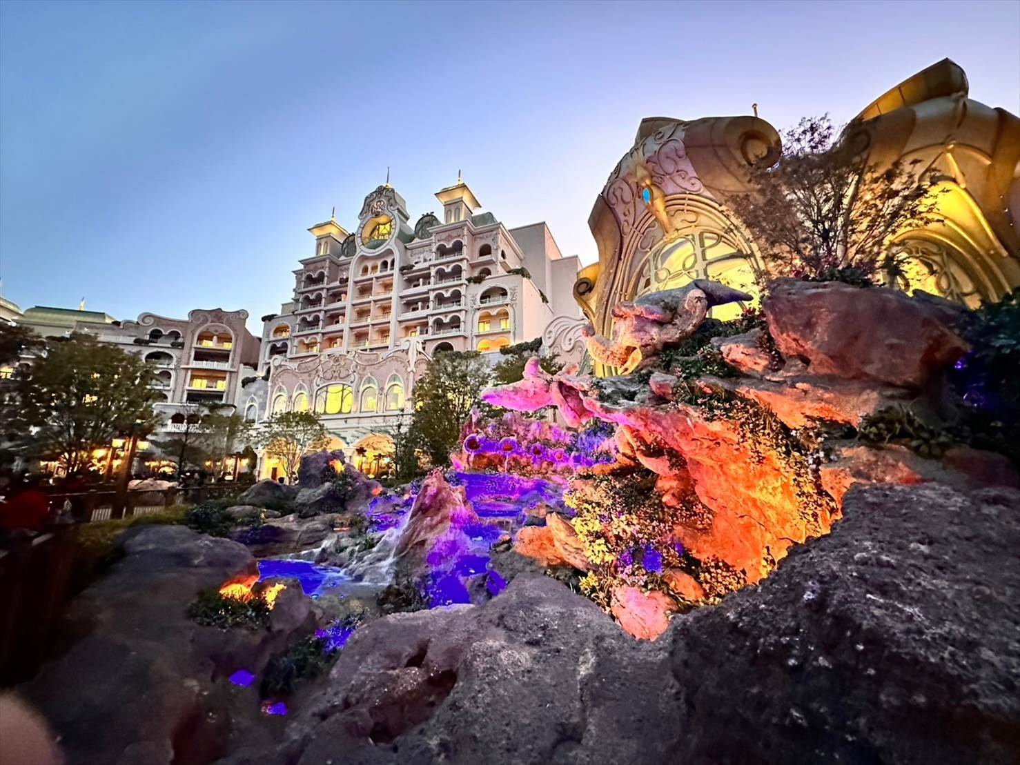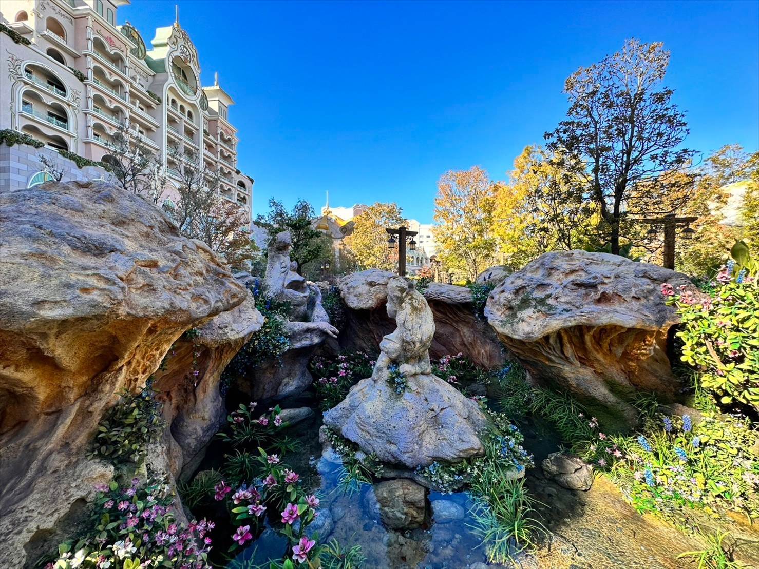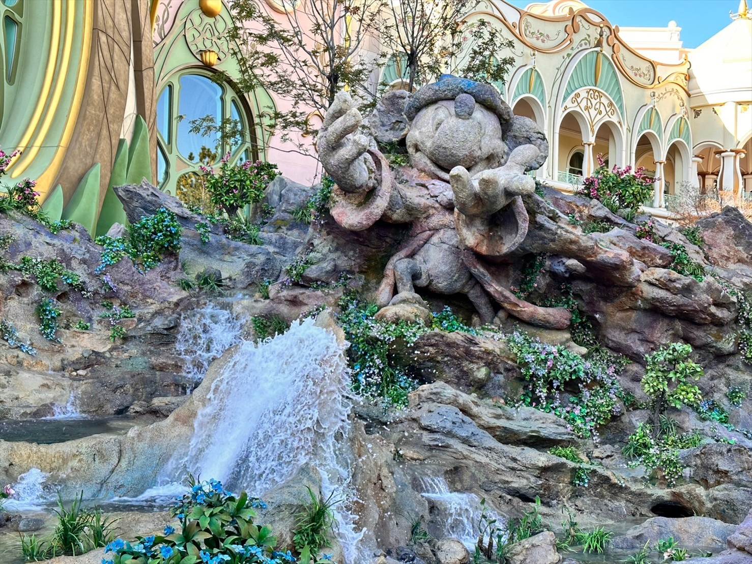 ▲ファンタジースプリングスホテルの周辺は、ところどころにキャラクターのロックワークと噴水が設けられています。