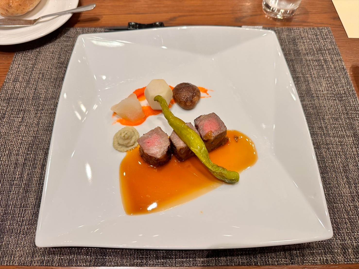 ▲そして六品目、かつメインのお料理「特選黒毛和牛ロース肉のロースト わさび添え」が提供されました。