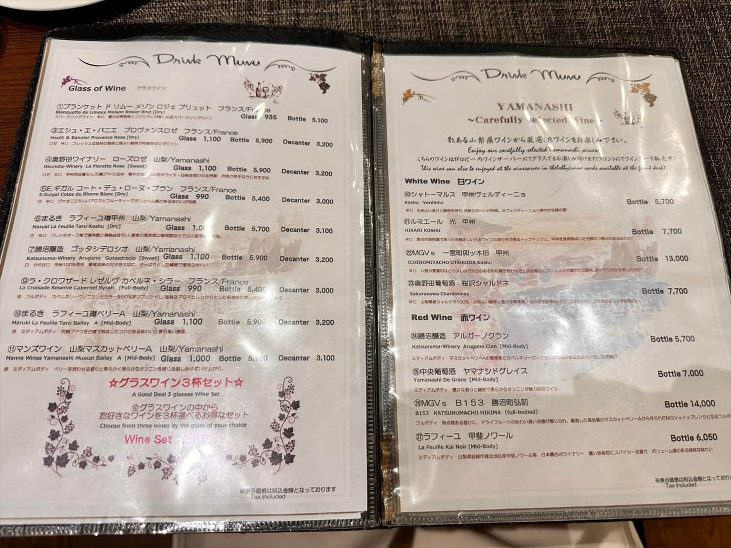 グラスワインは主にフランス産のワインと、山梨のワインがラインナップされています。