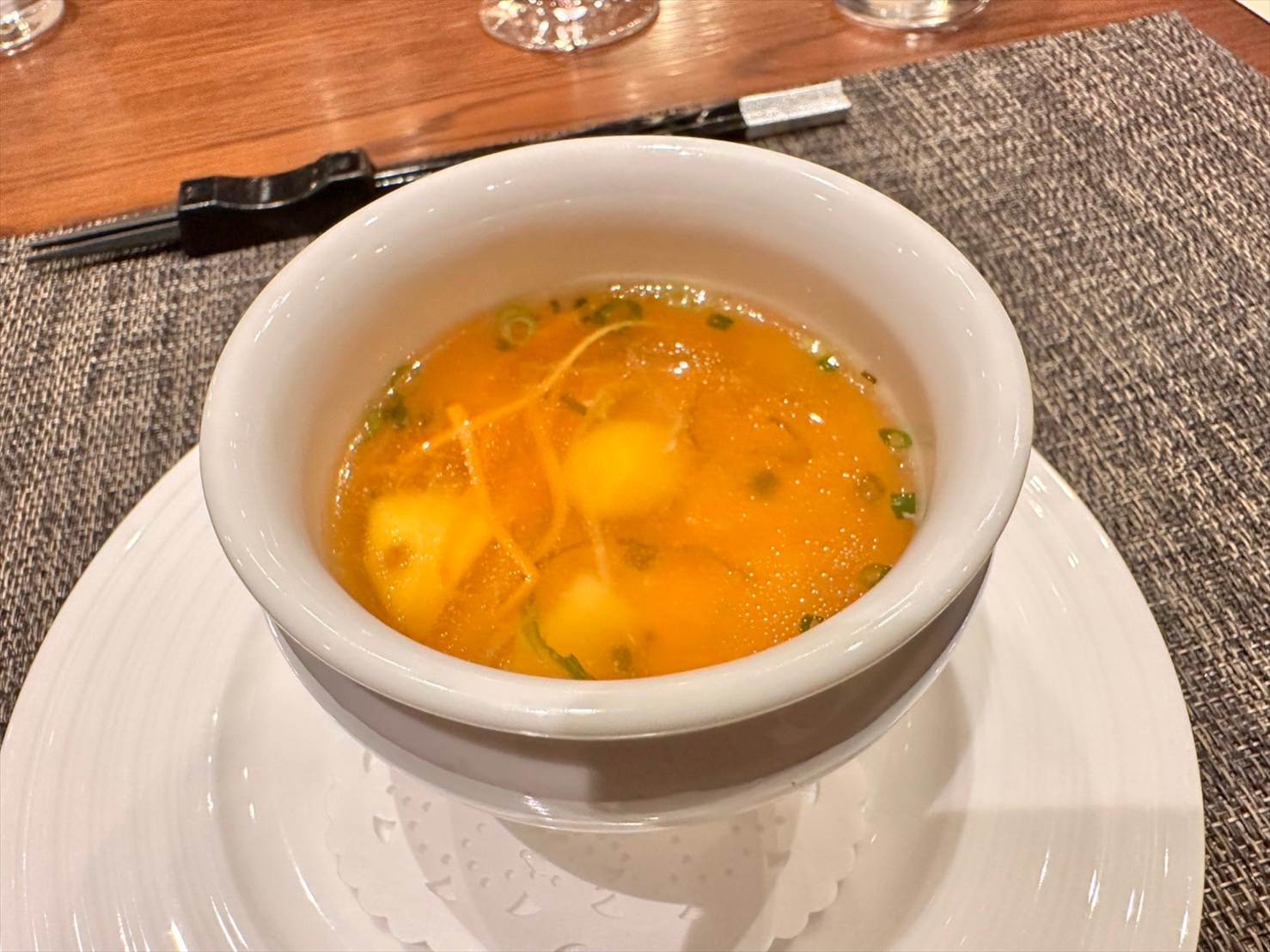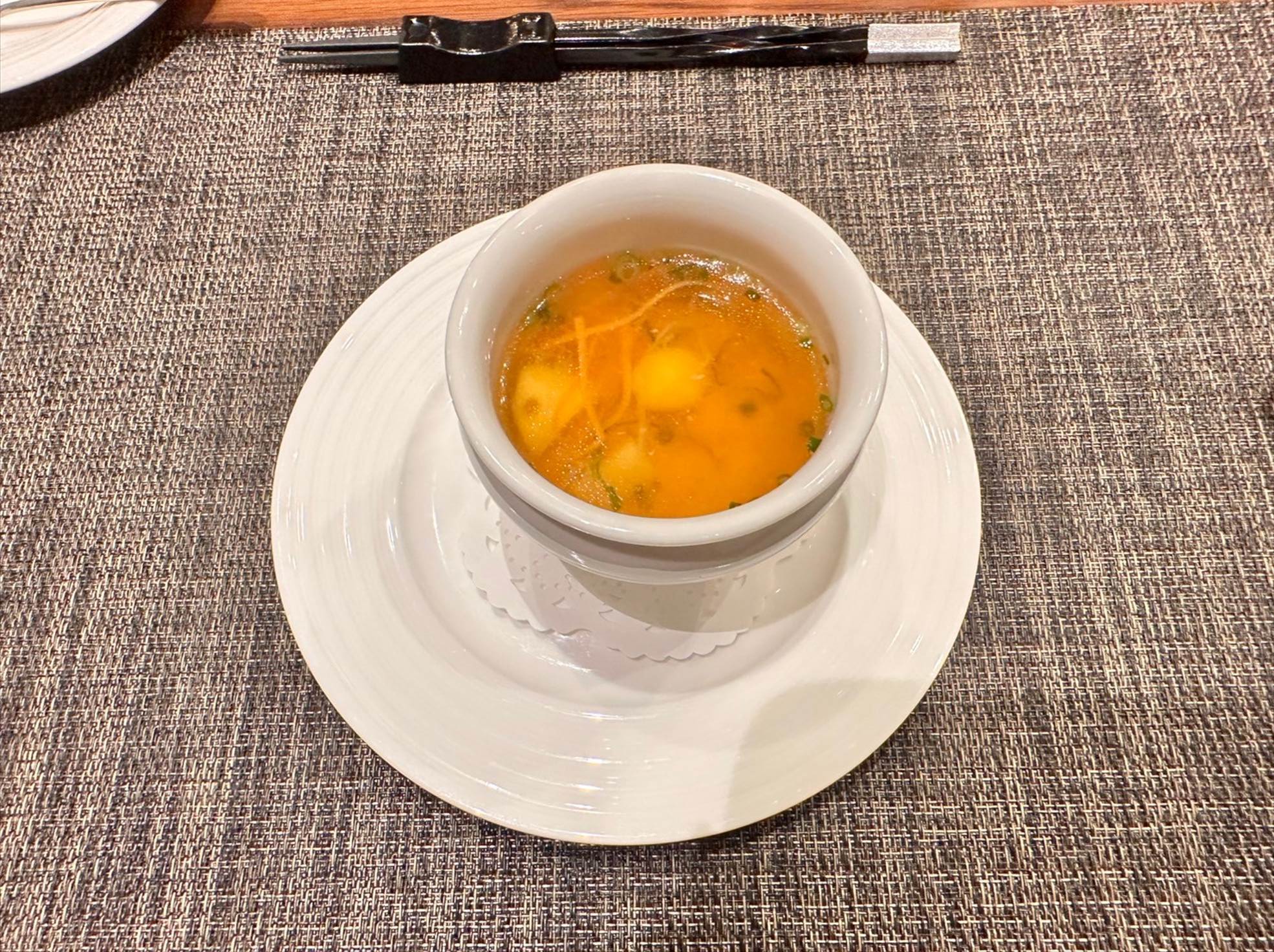 ▲四品目は「トリュフのロワイヤル ビーフコンソメ」。