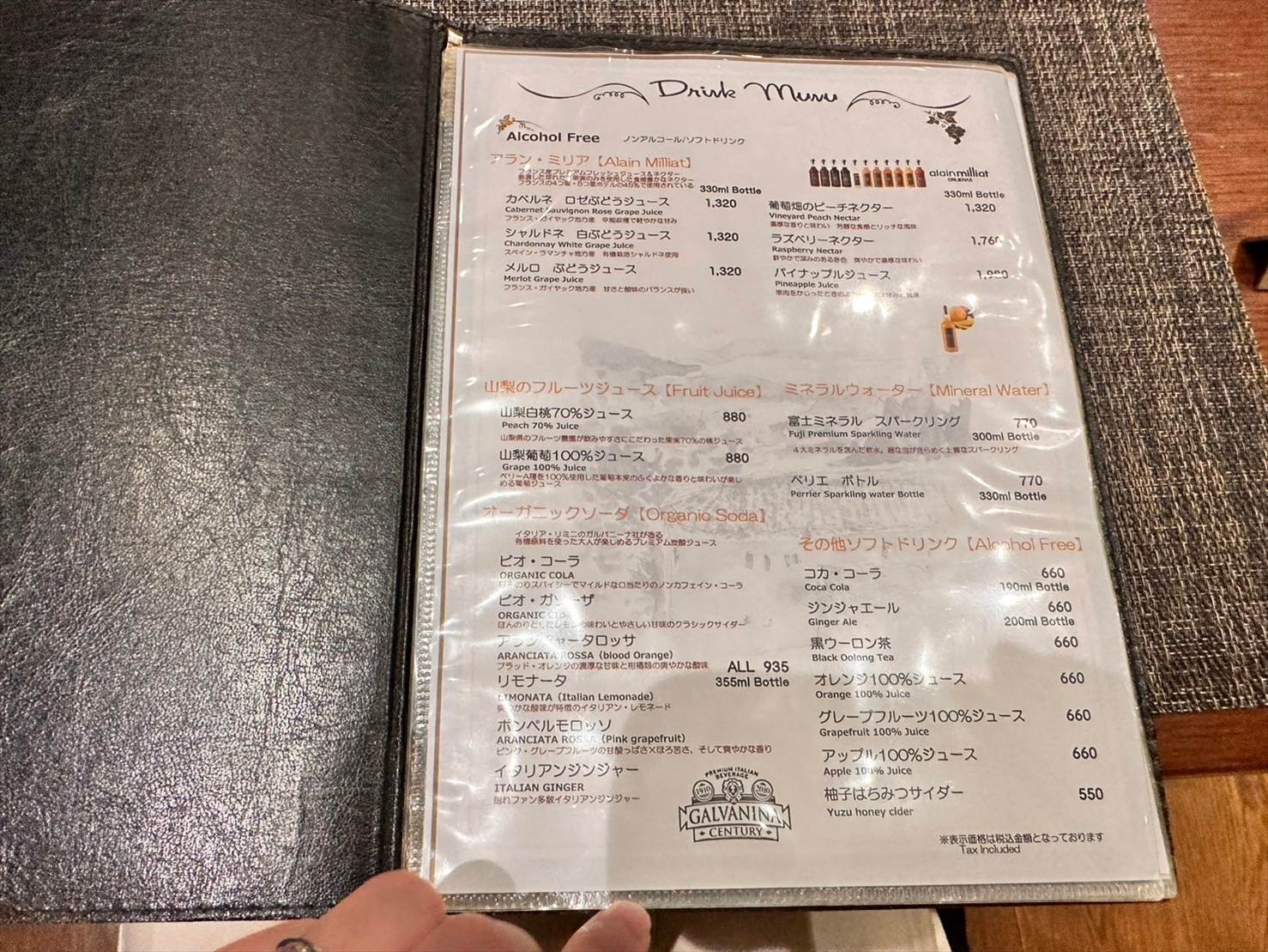 ジュース類以外にもフランスらしいノンアルコールカクテルや、山梨らしいご当地ドリンクも用意されており、とっても種類豊富!
