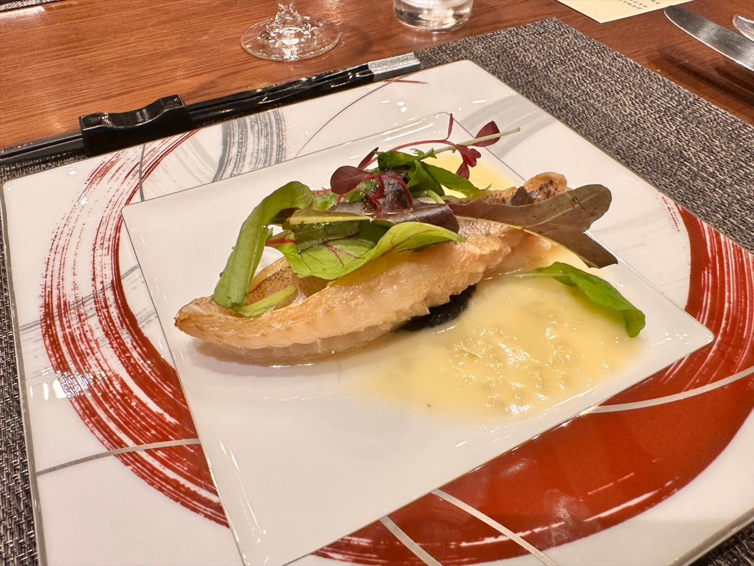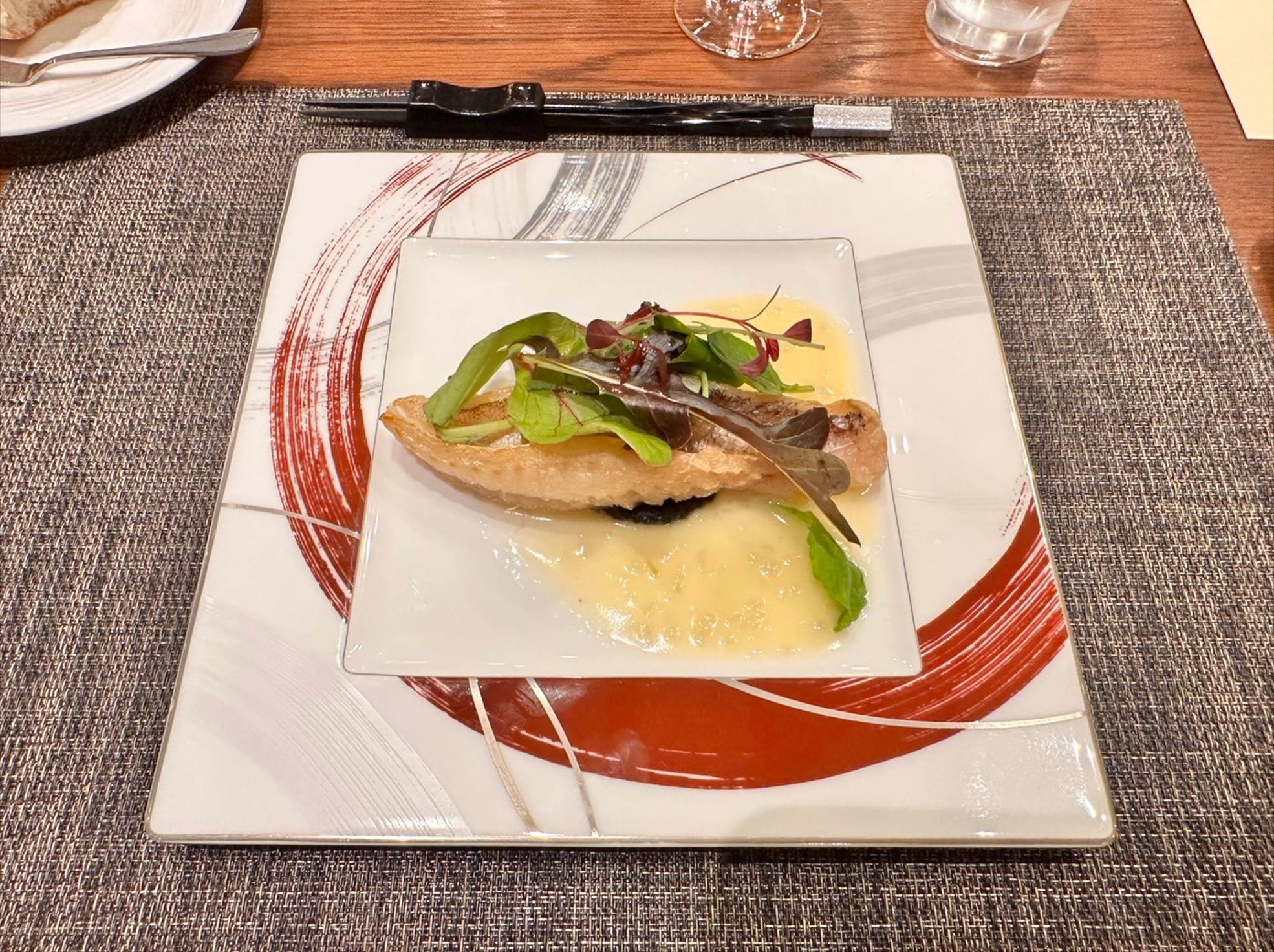 ▲五品目は「甘鯛のグリエ イカ墨のじゃが芋のピュレ ブールブランソース」。
