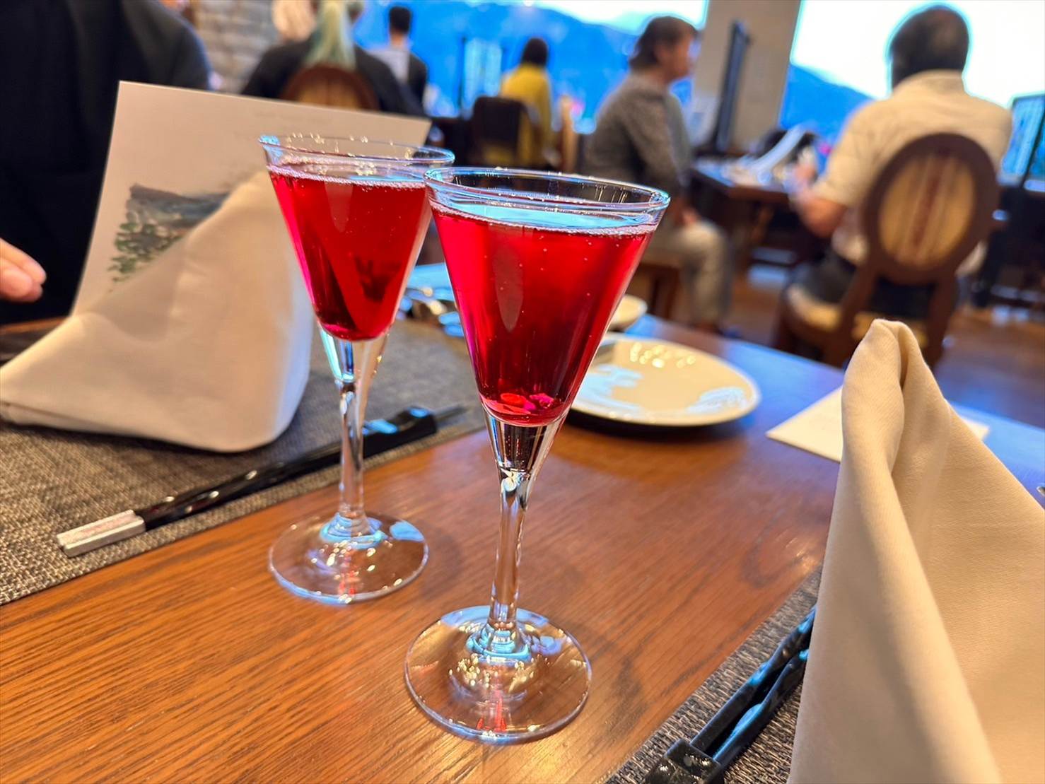 席についた段階では赤紫蘇のシロップのみが注がれており、程よいタイミングでスパークリングワインを後から注いでいただけました。