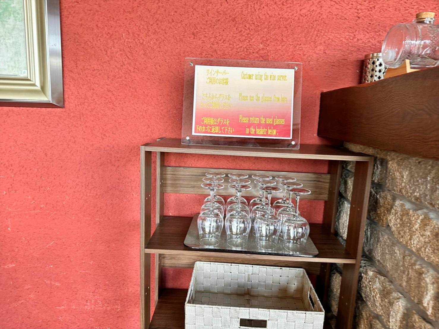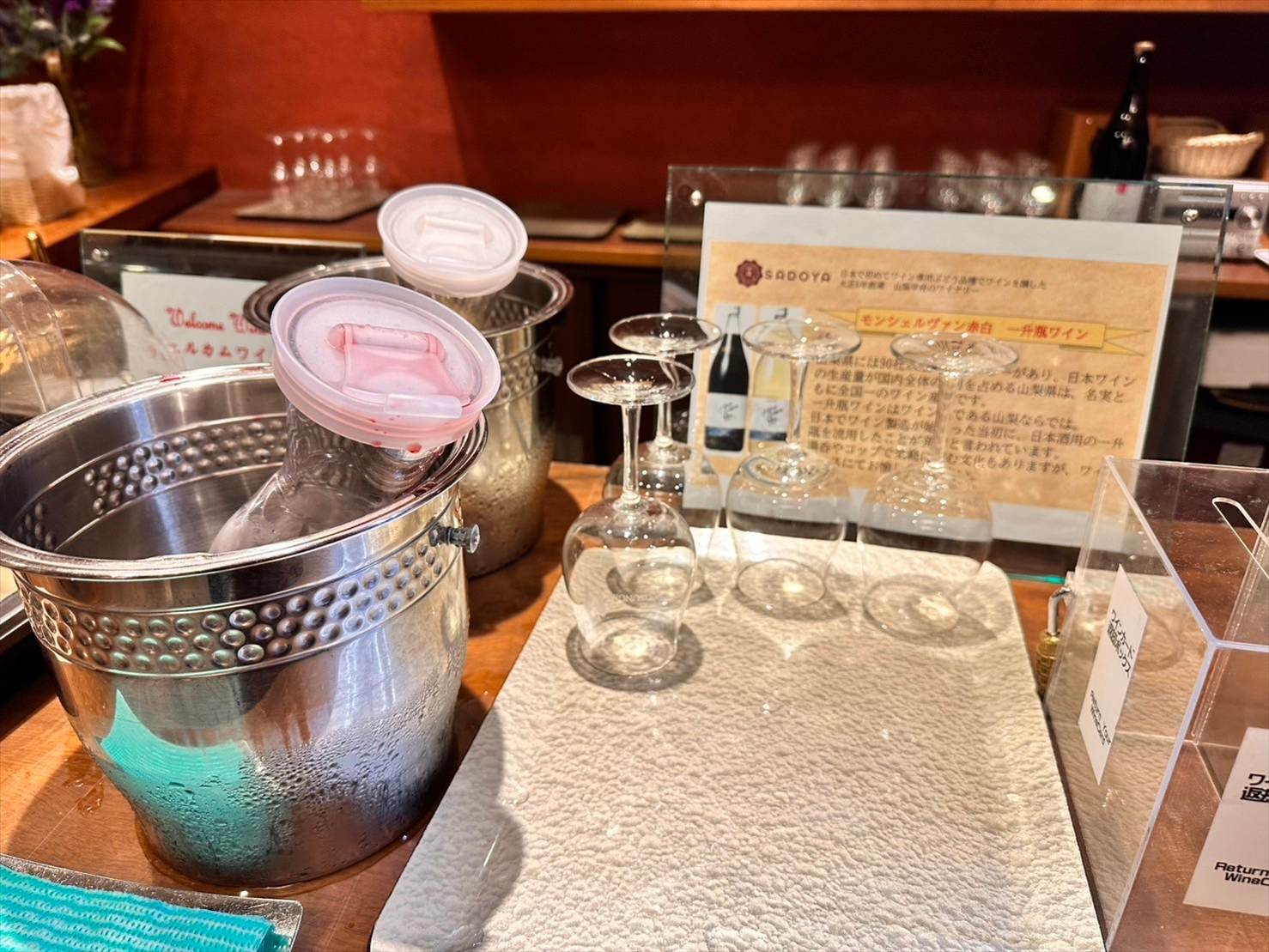 ▲ワインは用意されているワイングラスに、自分で好きなだけ注いでいただくことができます。