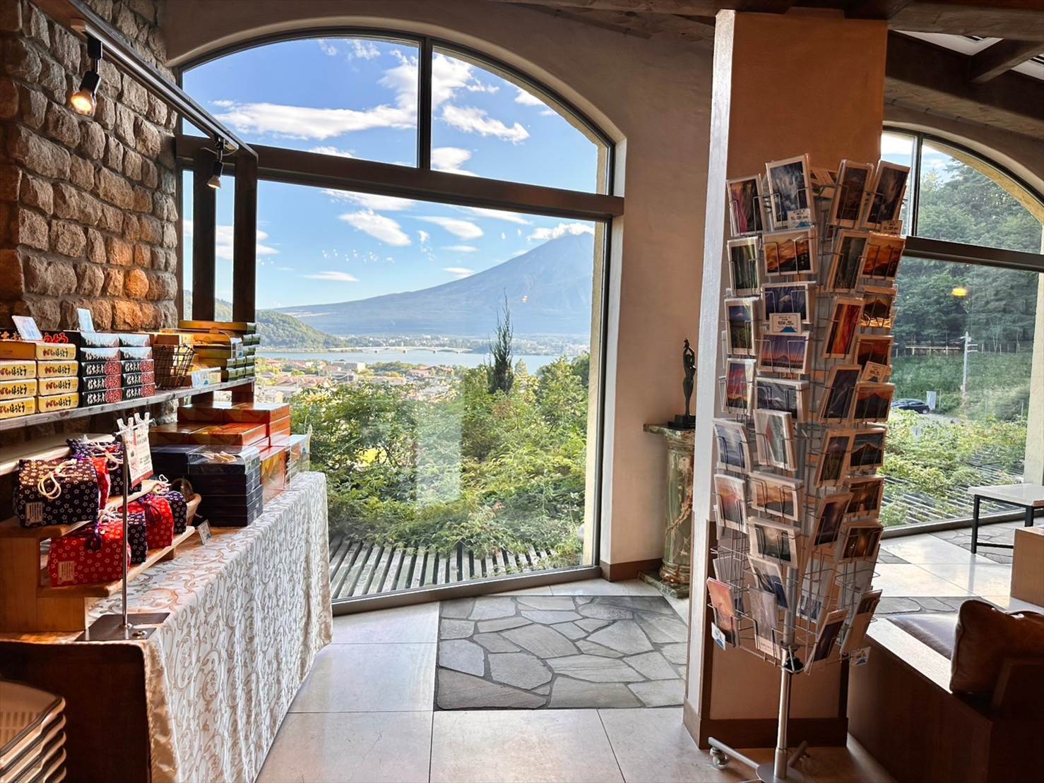 ▲ちょうど富士山を拝める窓の近くに、富士山の絶景を描いたポストカードが販売されていました。