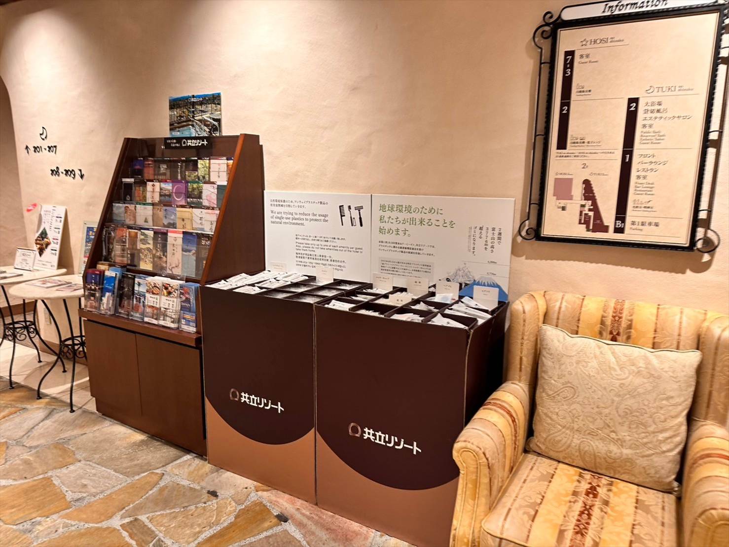 ▲共立リゾートの他のホテルの紹介や、周辺観光の案内MAPなどが沢山用意されていました。