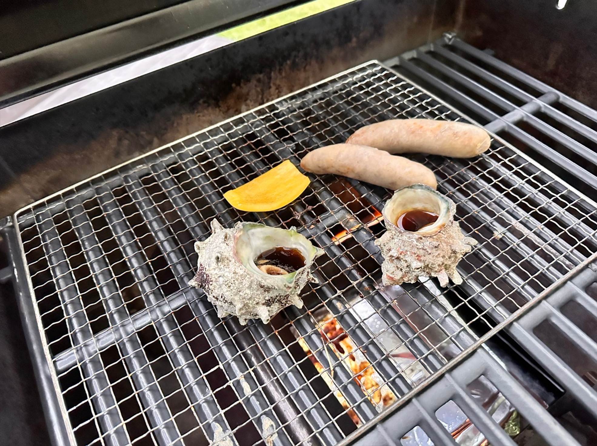 ▲お次はサザエのつぼ焼きに、「スイスソーセージ グリルフランクフルターヴルスト」をコンロの上へ。