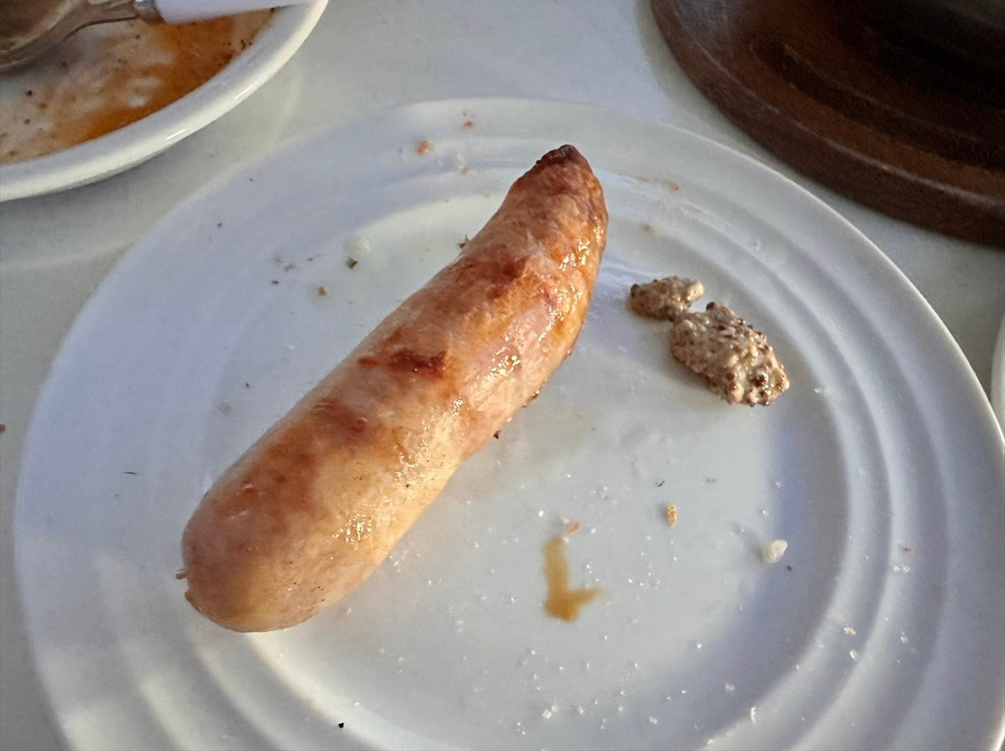 複雑なスパイスの味がギューッと染み込んだ肉肉しいソーセージで、粒マスタードをつけて食べるのが、もう最高!