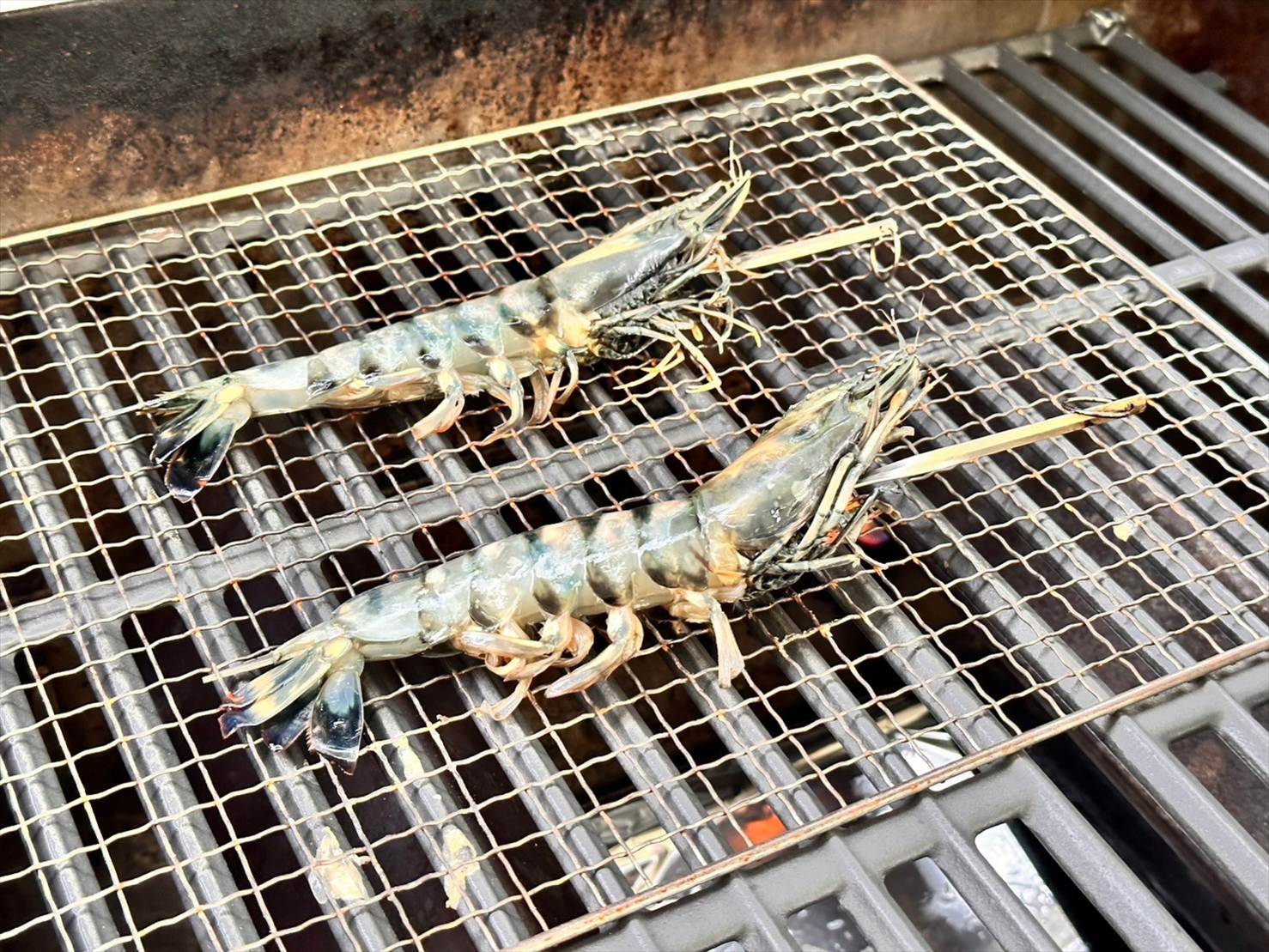 ▲有頭海老もコンロの上へ!大きな頭付きのエビが串に刺さっており、もう見るからに美味しそう。