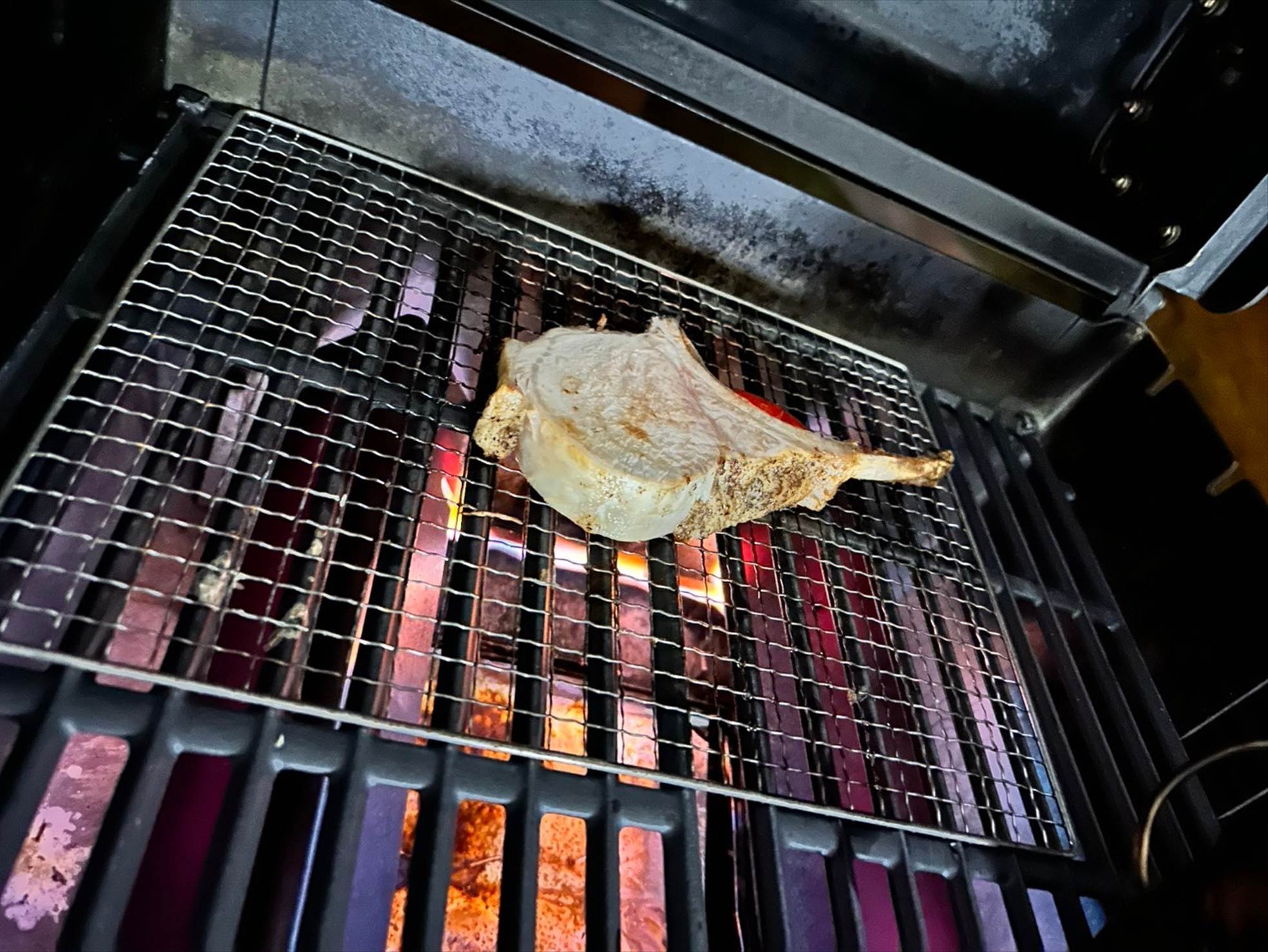 大きな骨付きの豚肉を、豪快にいただける一品。すでに火は通っているので、表面に焼色が付く程度でOKとのことでした。