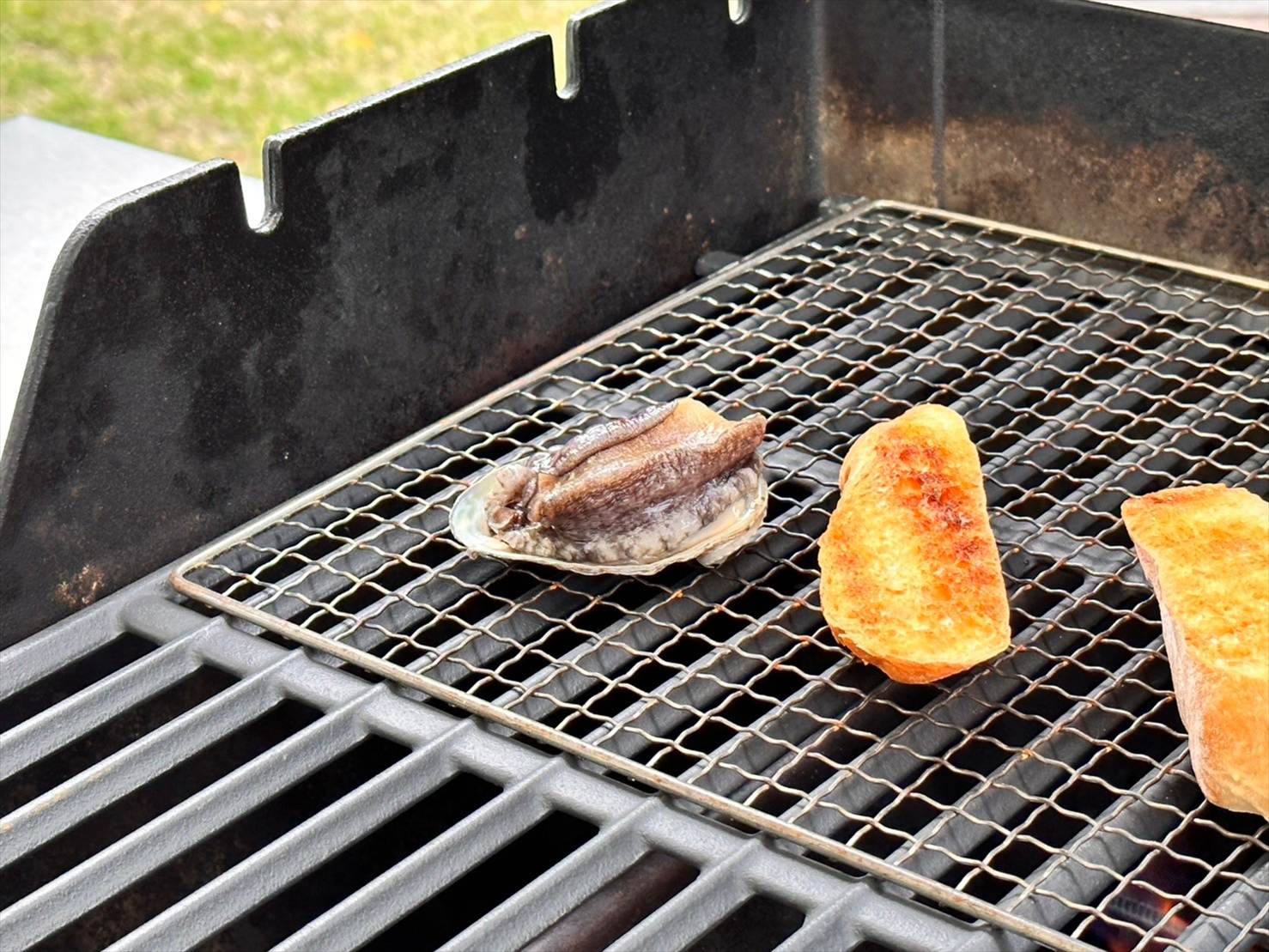 ▲ある程度焼けてきたタイミングでアワビもコンロに乗っけてみました。