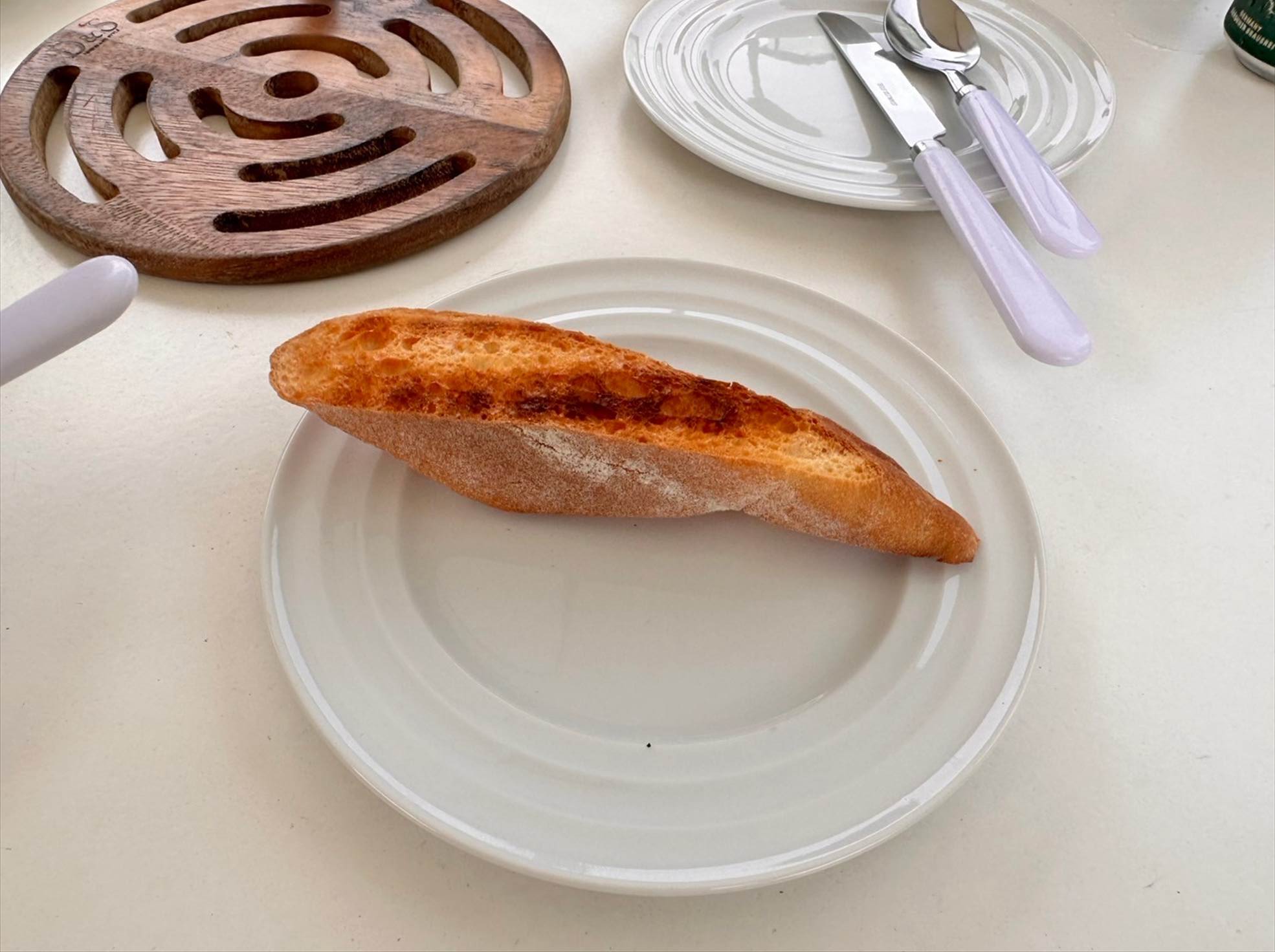 ▲バケットも焼き上がったので、アヒージョとともにいただきます。