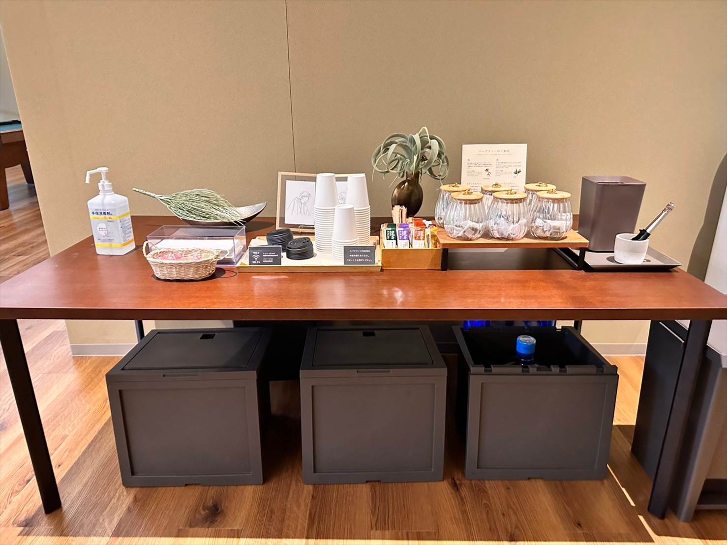 ハーブティーやブレンディスティックなどが用意されており、運動後にほっと一息つくのにぴったりのラインナップ。