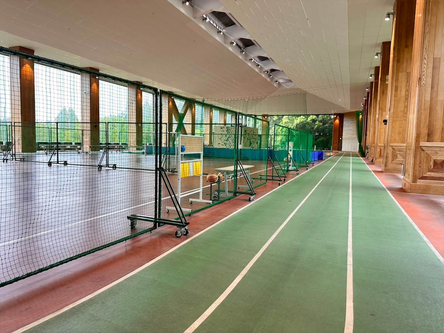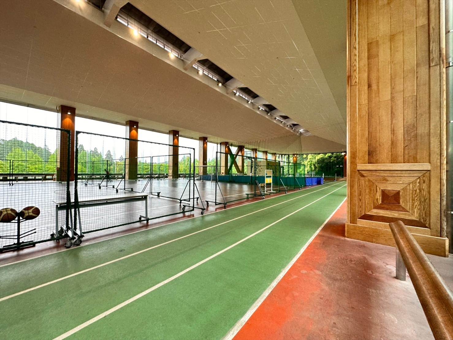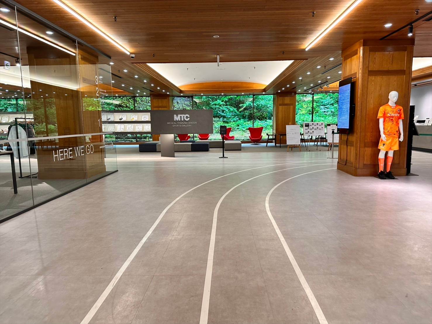 陸上のトラックを模した床に、おしゃれな木製の天井。奥にはリソルの森の緑が映えていてとってもいい雰囲気です☺️
