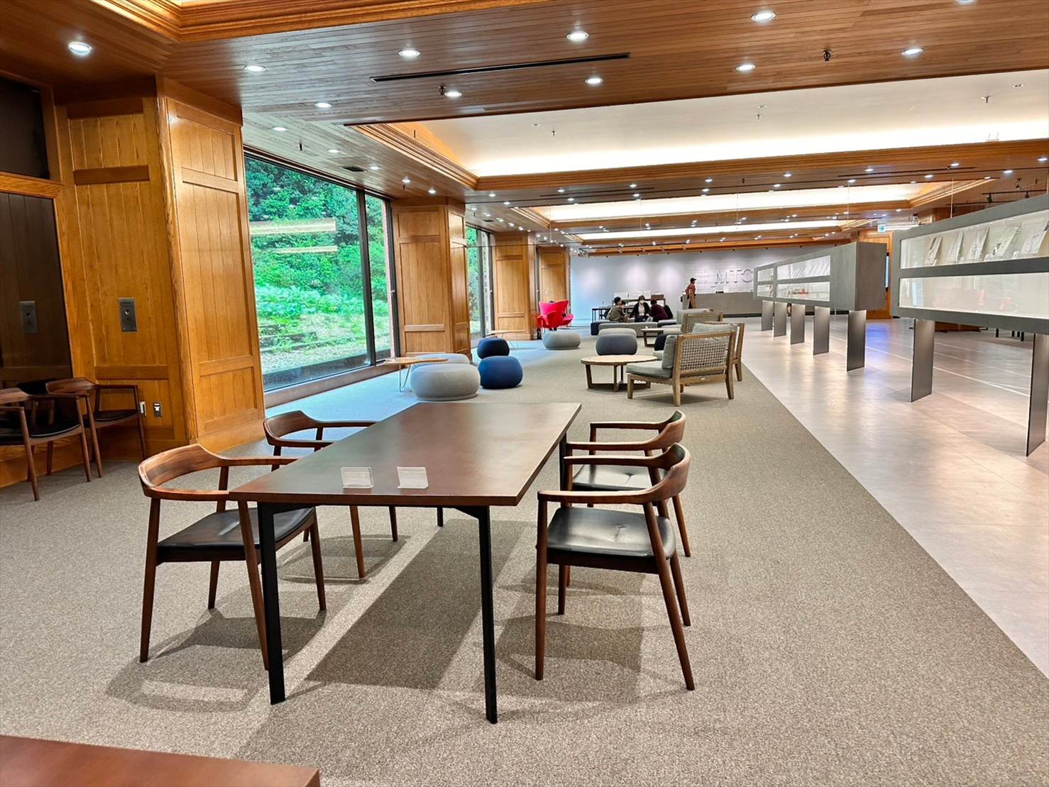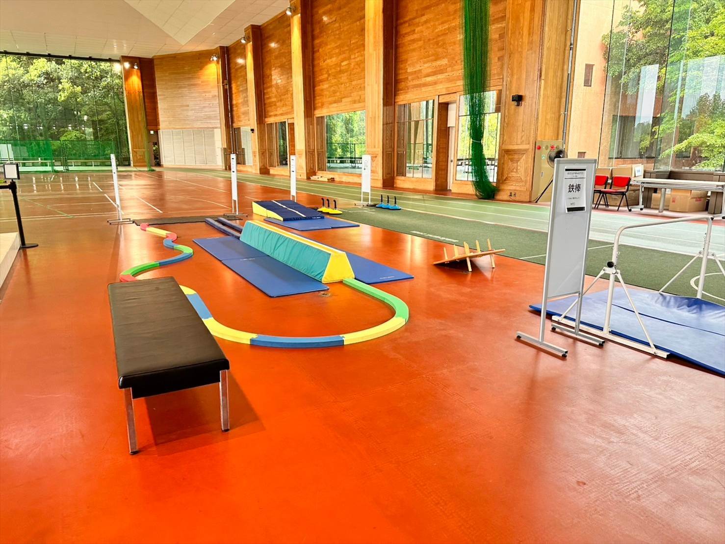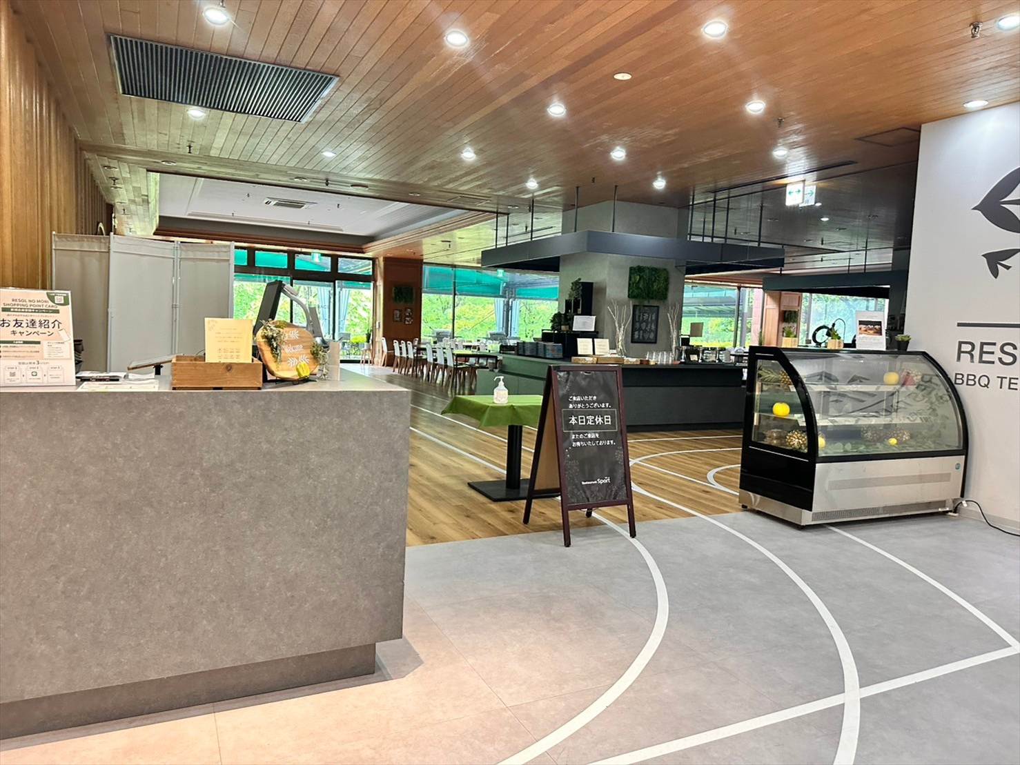 陸上のトラックを模した床に、おしゃれな木製の天井。奥にはリソルの森の緑が映えていてとってもいい雰囲気です☺️