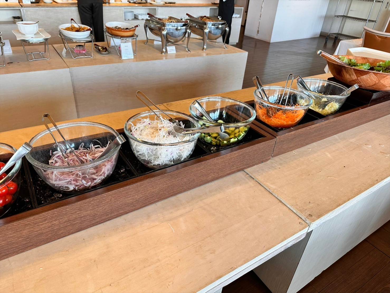 まずはサラダ類。レタスや人参、玉ねぎといった生野菜がずらりと並んでいます。