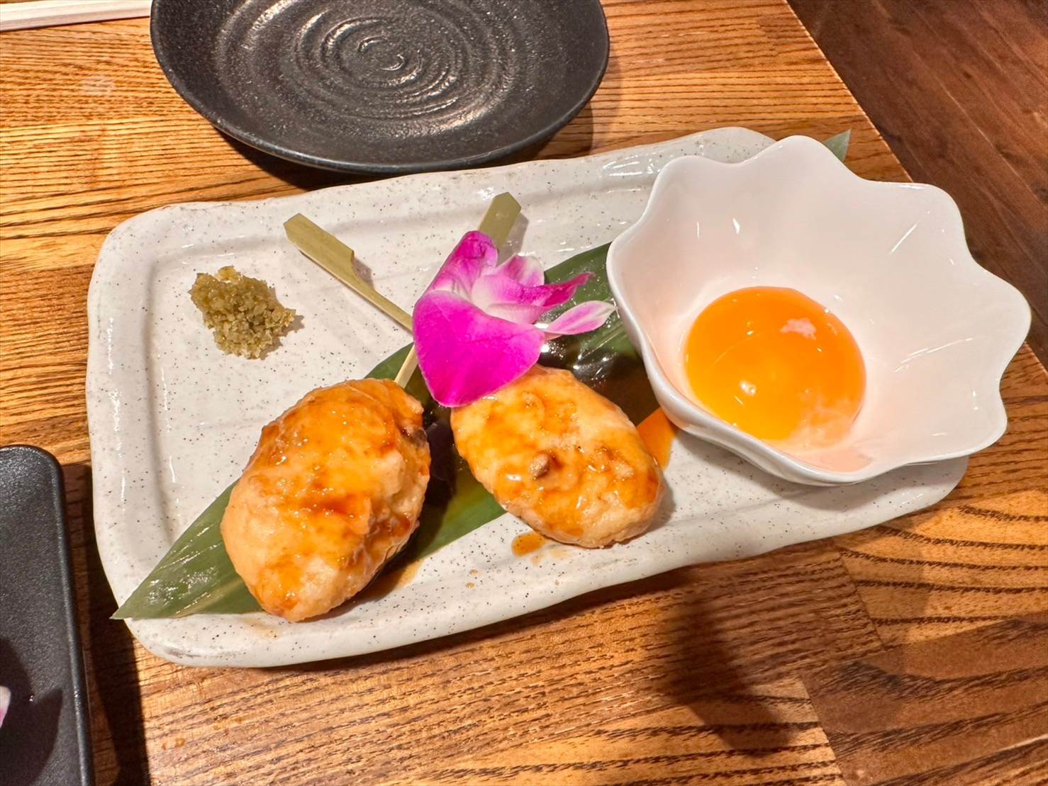 コリッとした食感のジューシーなつくねに生卵をつけていただきます。美味しい。