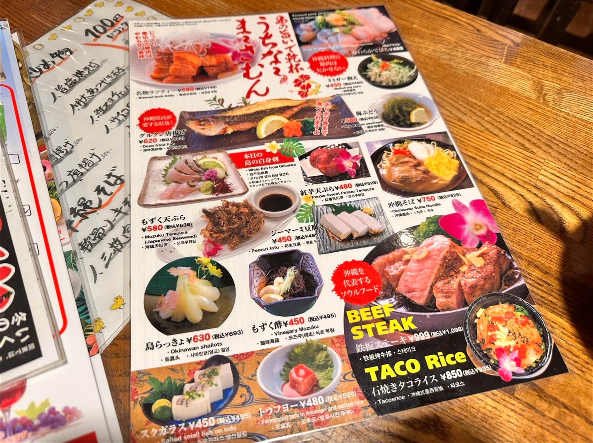 居酒屋の定番メニューから「ちんすこう天」等といった他では見かけないようなメニューもあって面白いです。