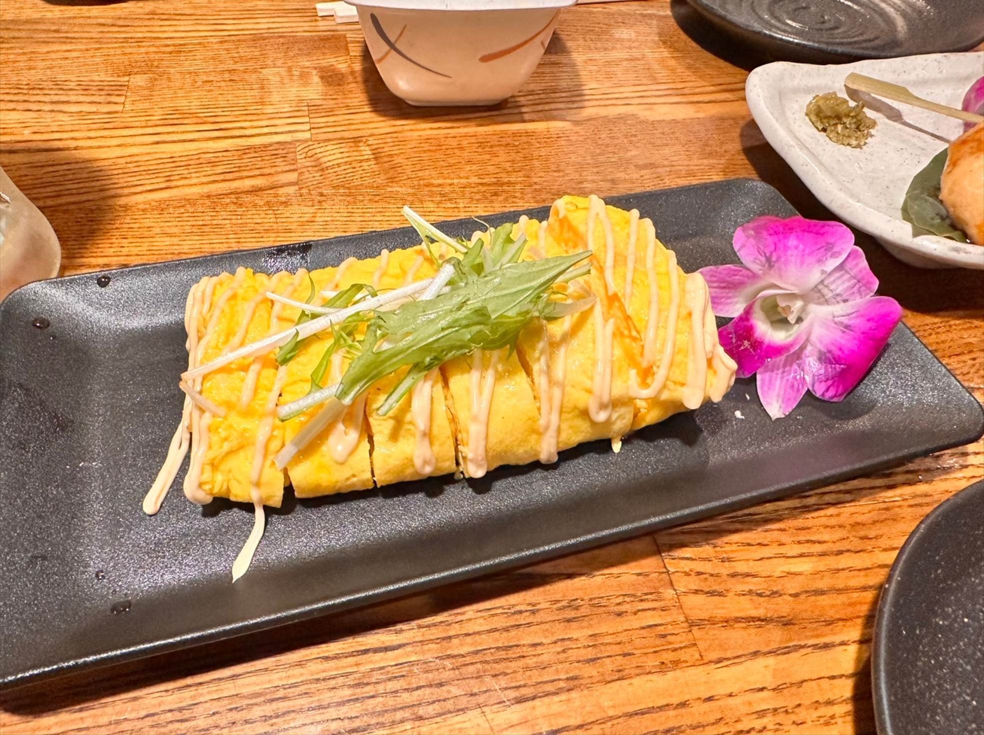 あつあつでほんのり甘い厚焼き玉子に明太マヨがかかっています。ビールに合う逸品で、ごくごく飲み進めてしまいます…。