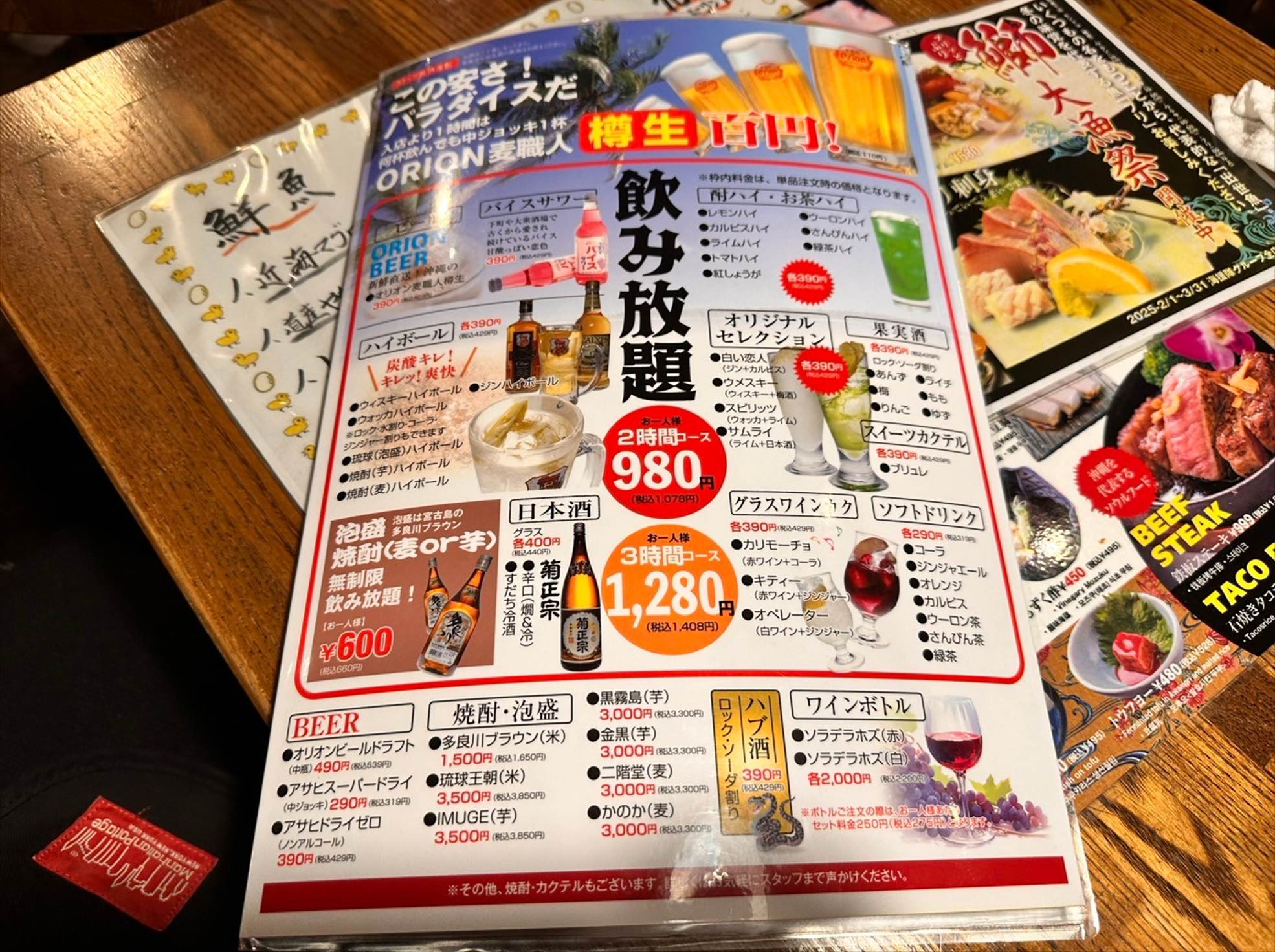 - 「入店から1時間ドリンク(オリオン麦職人含め)100円」は最高すぎる
