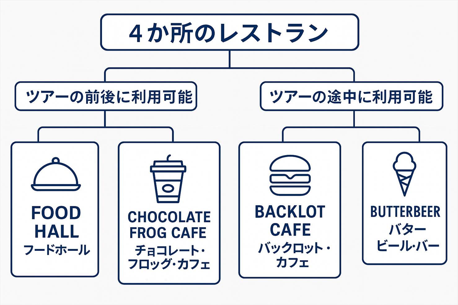 | 12:00~13:30 | バックロットカフェでランチ | 名物「バタービール」を楽しむのもGOOD。 休憩を兼ねてゆっくり過ごすのがおすすめです。 |