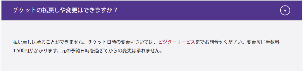 ▲唯一、公式サイトからチケットを購入した場合のみ、問い合わせを行うことで変更することはできますが、手数料として1,500円必要となります。
