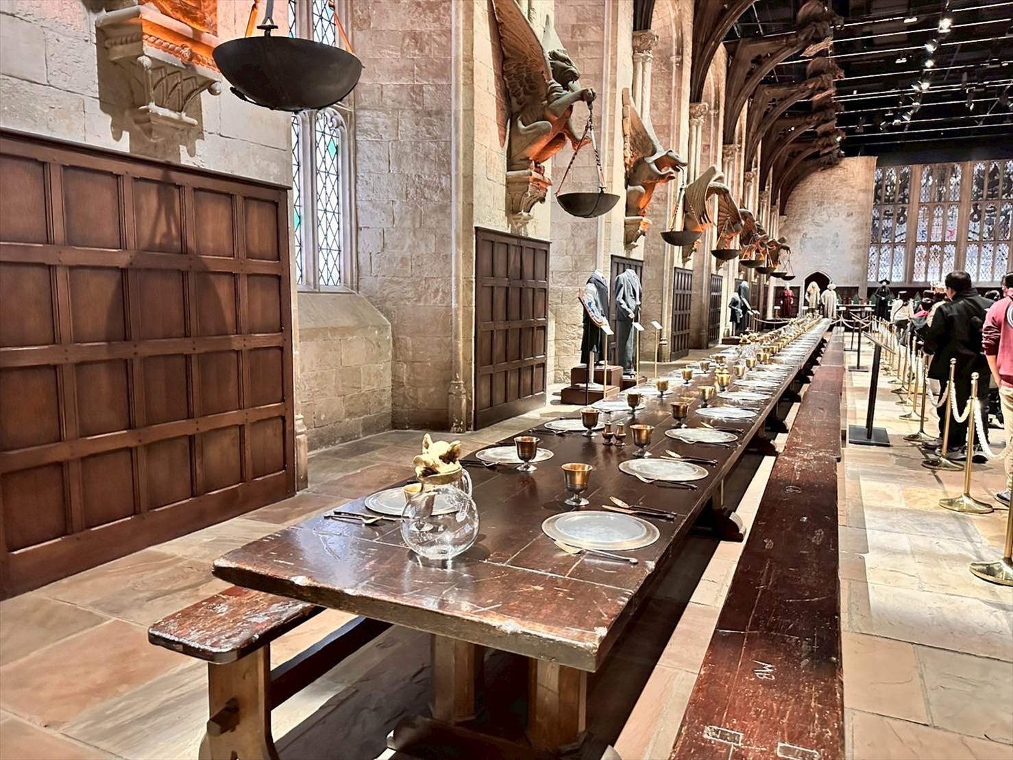 あのハリーたちが食事をしていた長テーブルも、周囲の石像も、教員卓の奥にあるステンドガラスもまさに映画そのもの。
