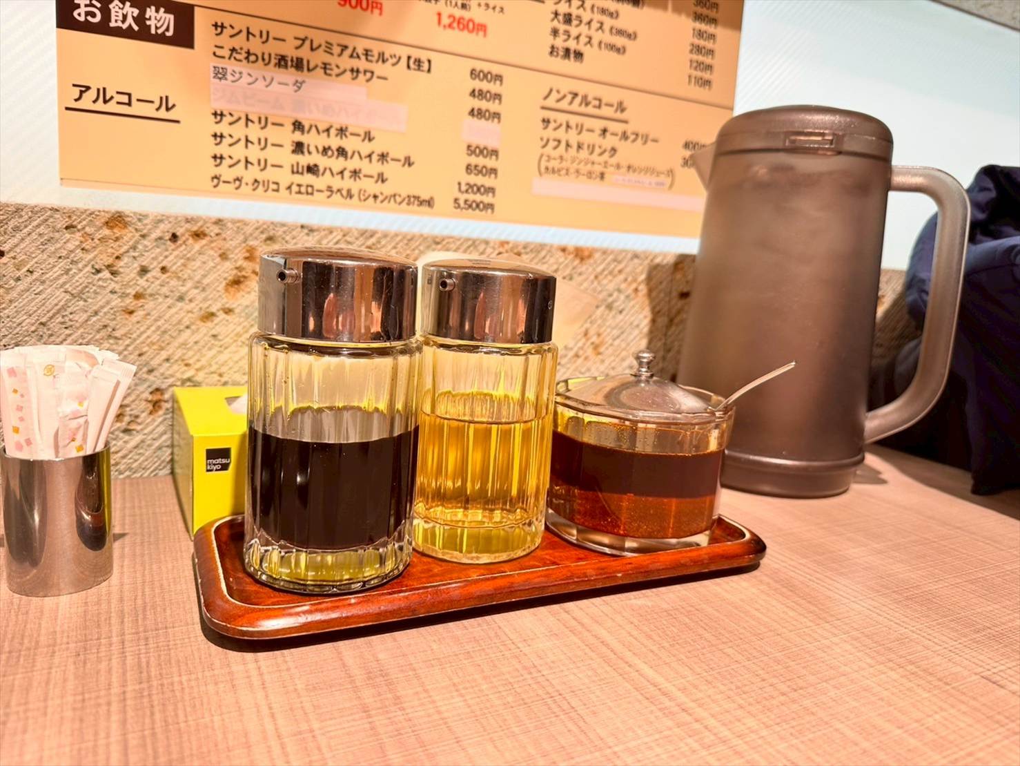 ▲店内に案内されると、客席には醤油・酢・ラー油の餃子3調味料がセットされていました!