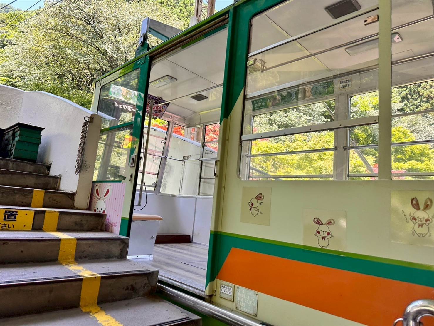 ▲弥彦村のキャラクターがあしらわれた、可愛らしいロープウェイにいざ乗り込みます!