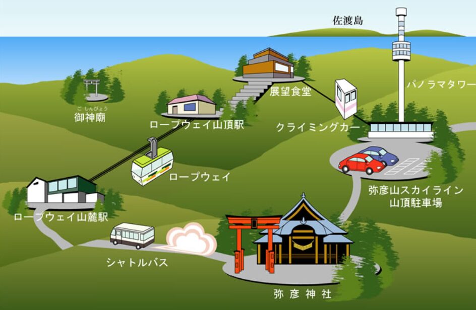 新潟県弥彦村に位置し、ロープウェイでの空中散歩と山頂からの絶景を楽しめるスポット。