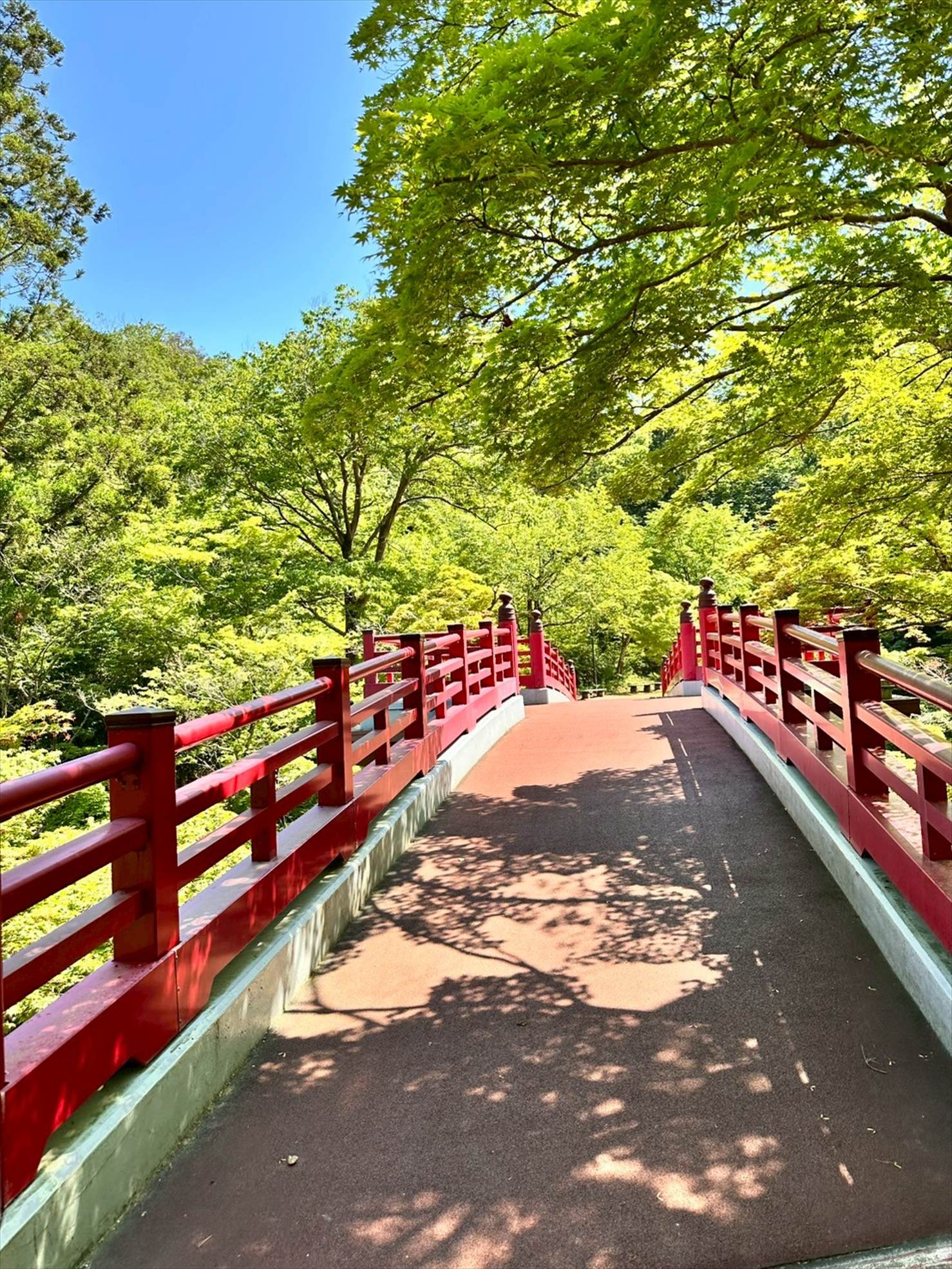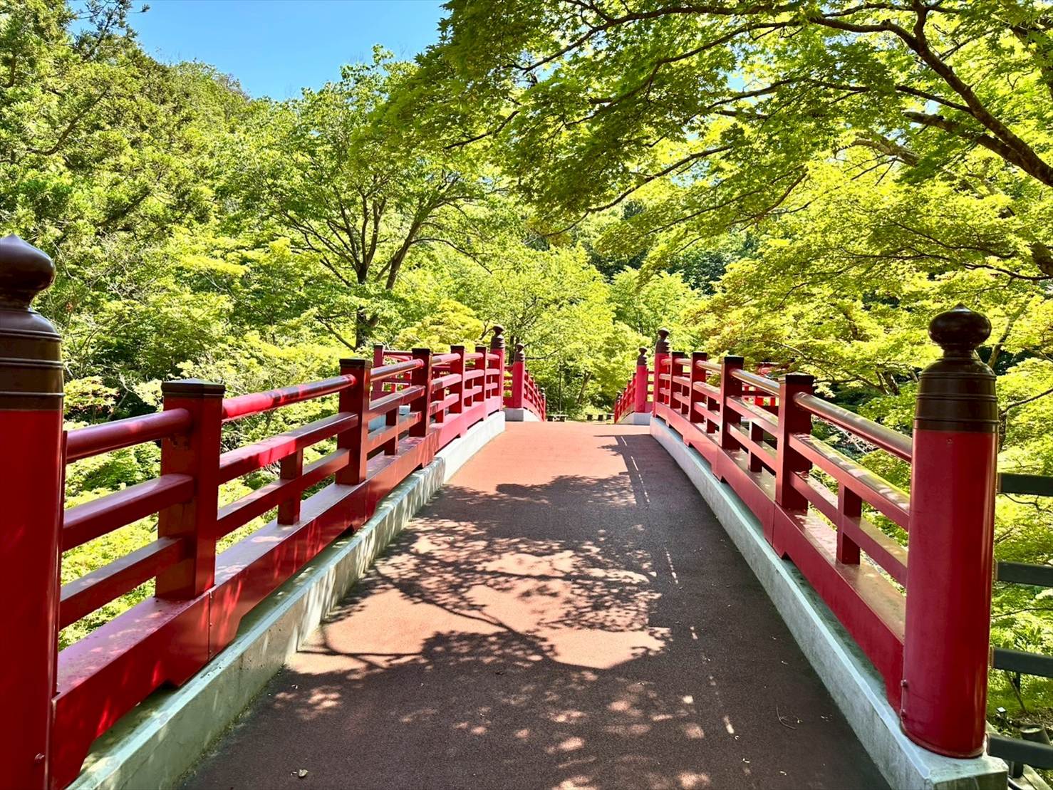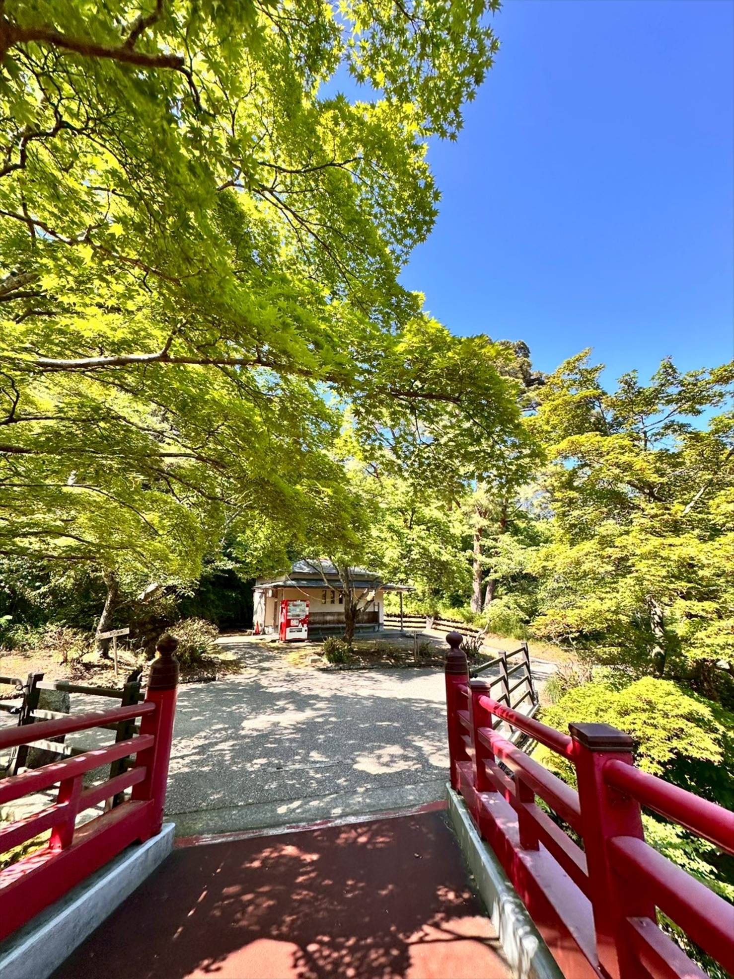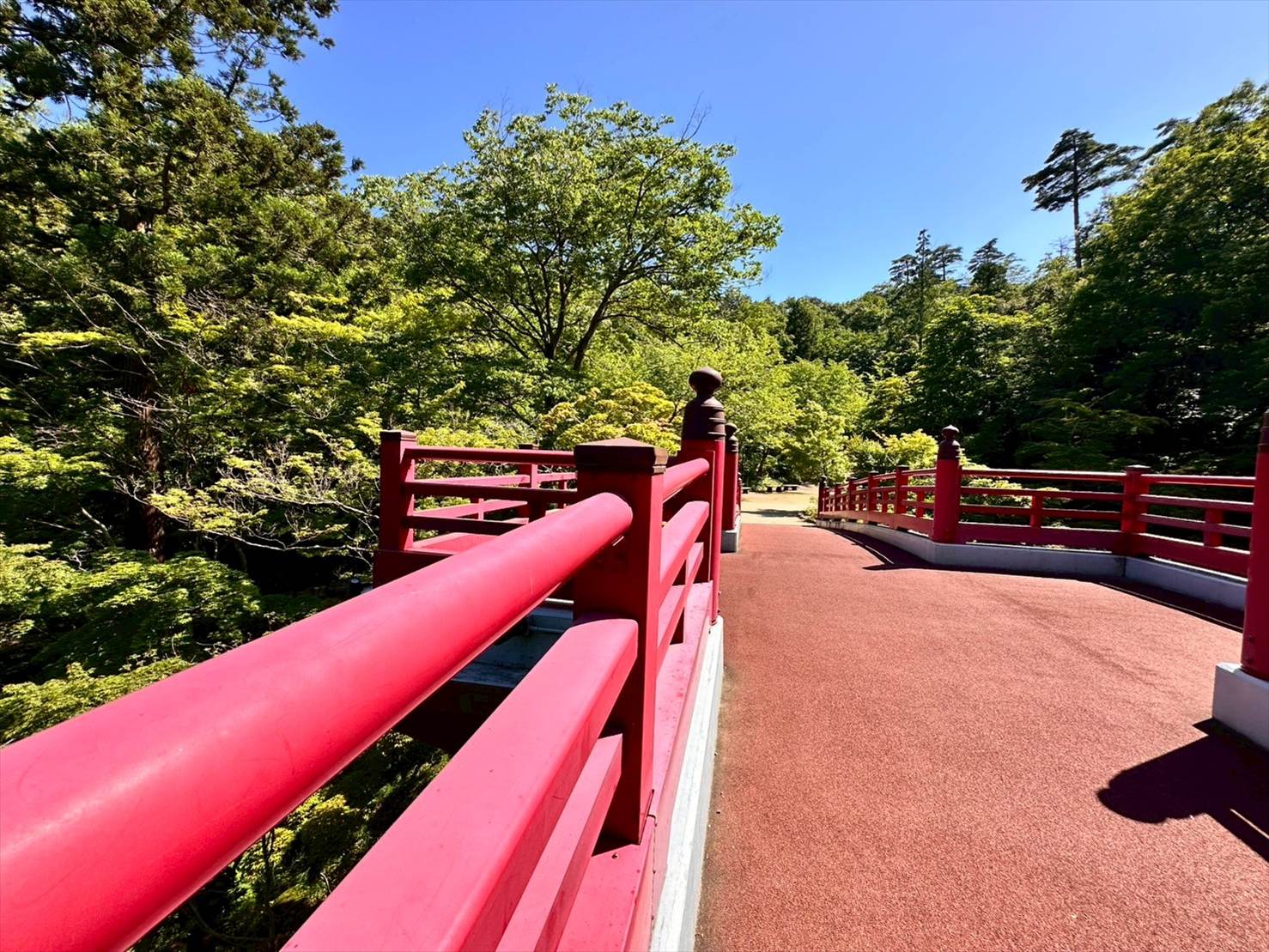 神社の中にかかっていそうな造形の橋で、どことなく鳥居を思い出させます。