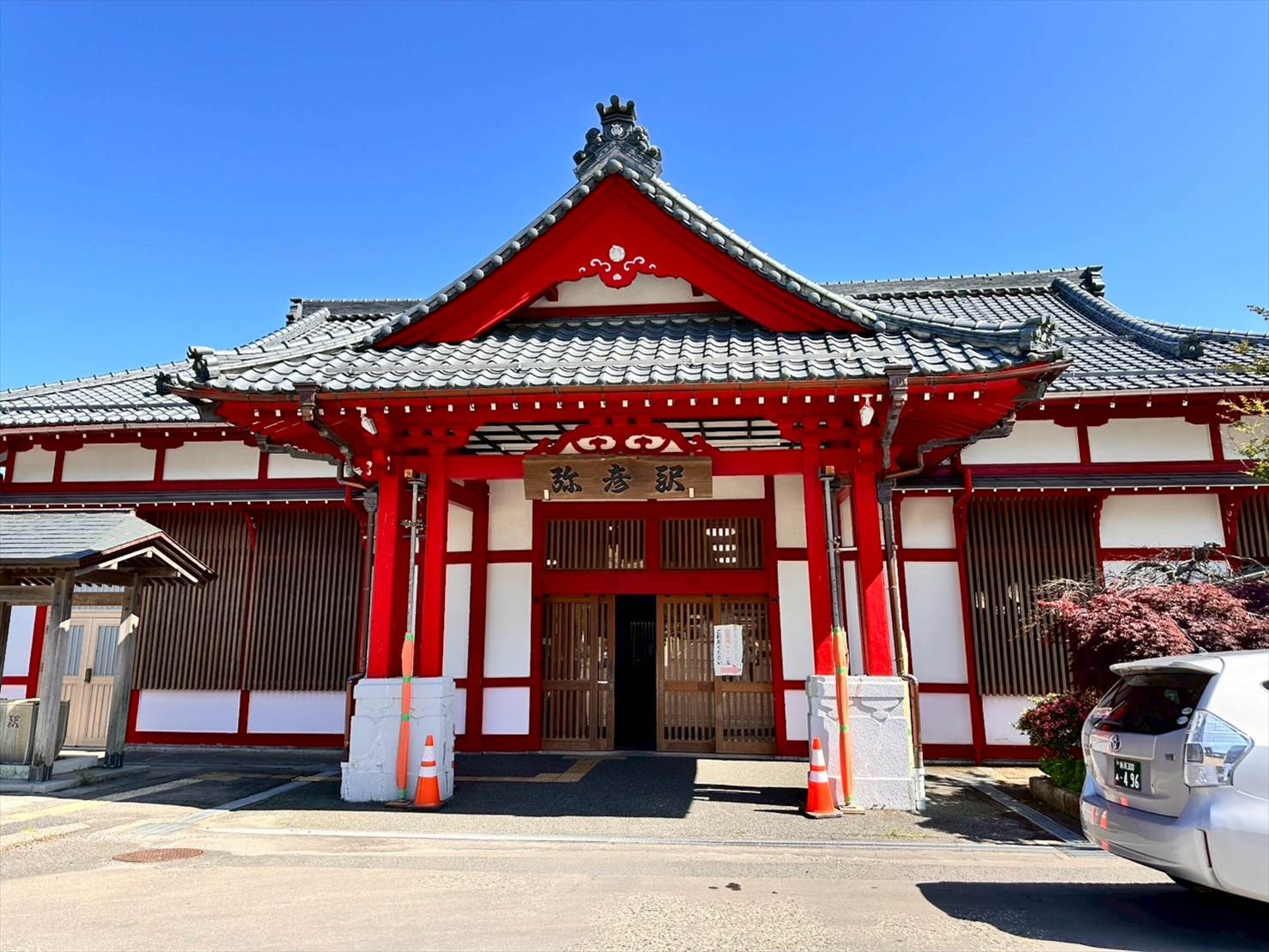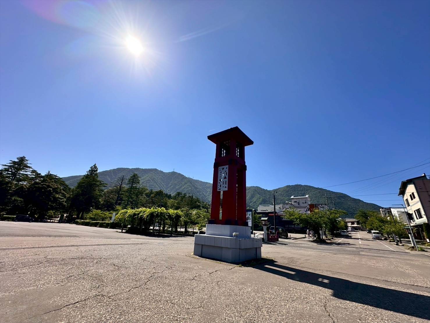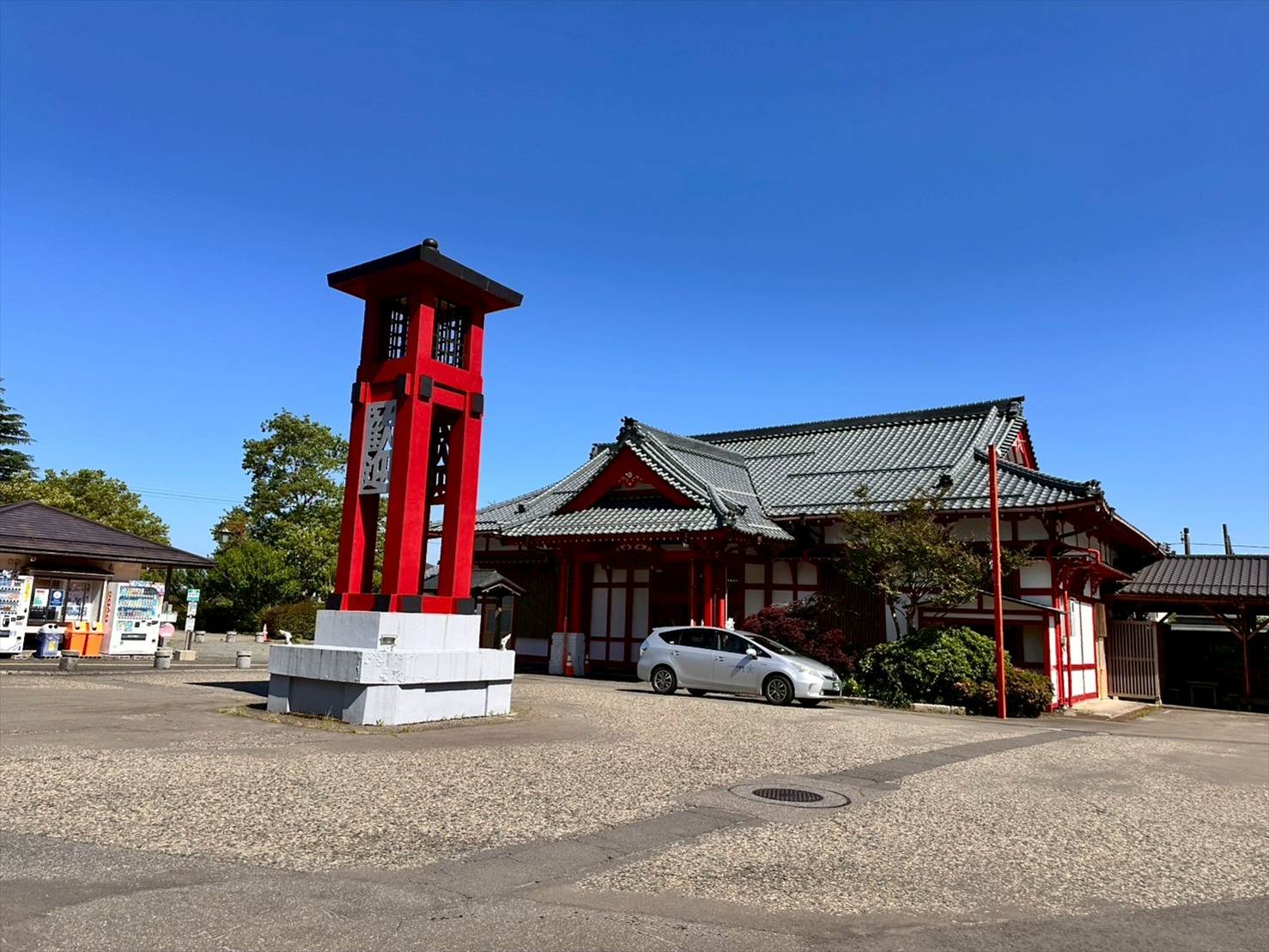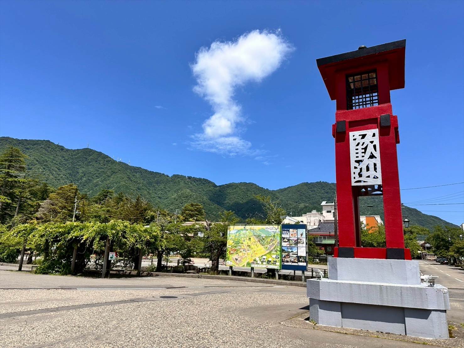 抜けるような青い空、そして弥彦駅前にある「歓迎」と書かれた赤いオブジェ。そして遠くに見える山々のコントラストがとにかく綺麗で、気持ち良いー!!