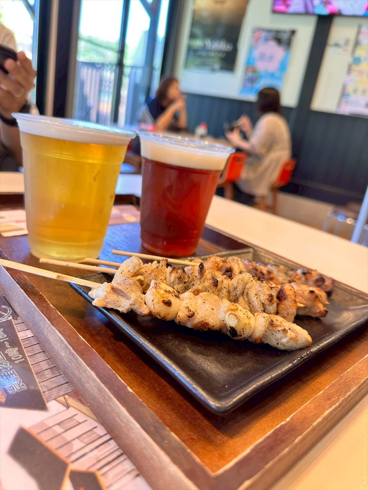 ▲フードコート内のお店で、焼き鳥の盛り合わせとクラフトビールをオーダー。