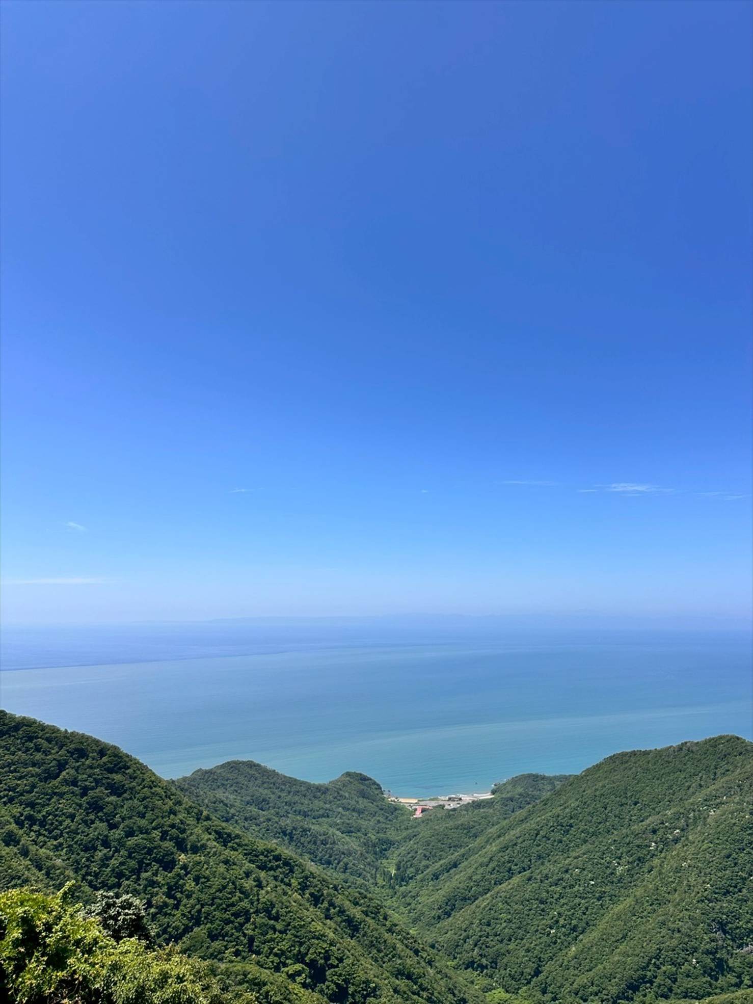 どこまでも抜けるような青空に、青い海…!うーっすらと遠くには佐渡島が見えています。