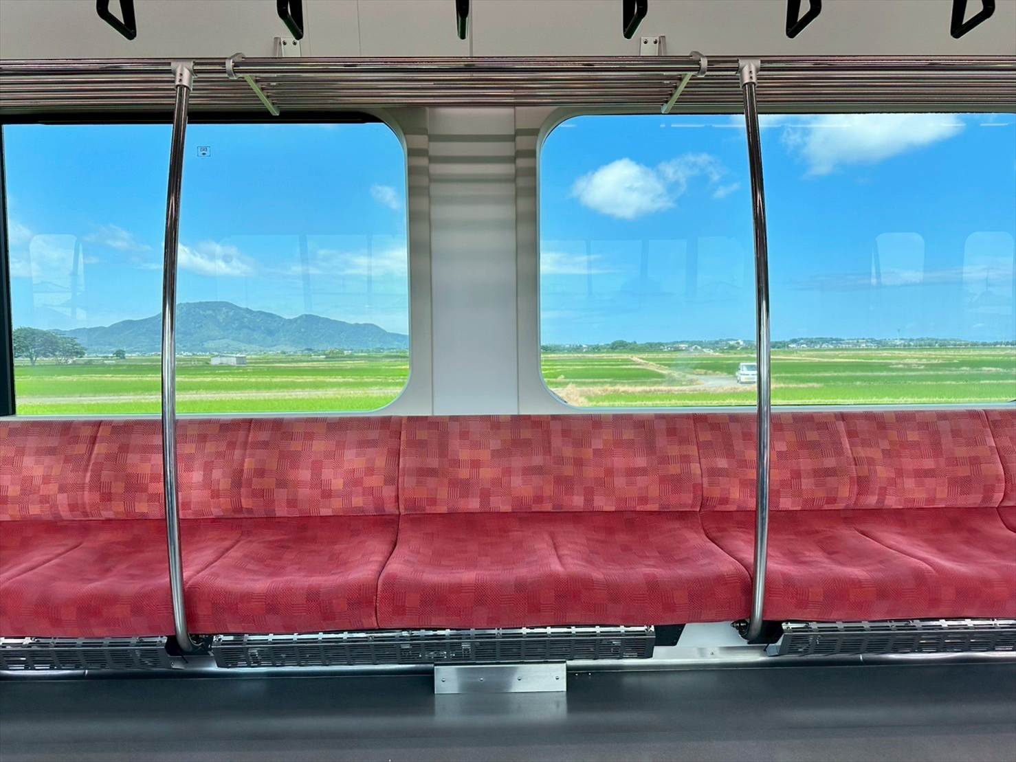 向かい合わせのボックスタイプの車両で、相変わらずどこまでも続く田んぼを眺めます。
