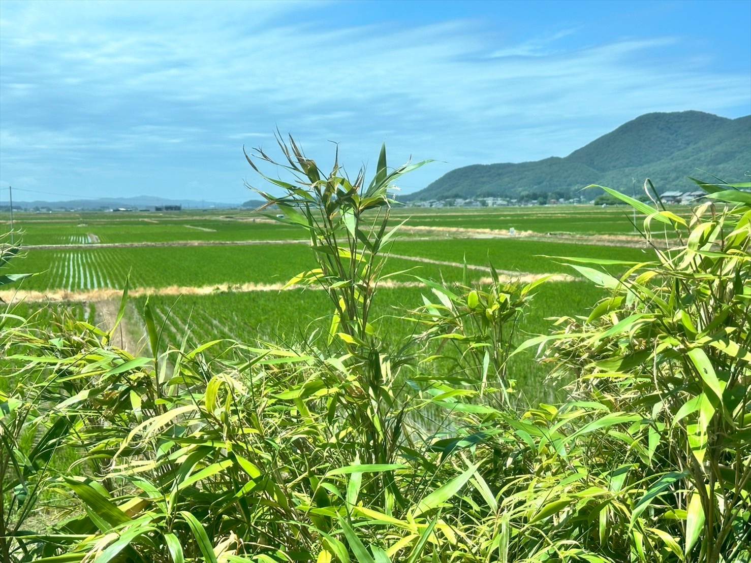 ここまで来ると車窓からの景色がこの写真のように、見渡す限り、どこまでも、緑の田んぼに。