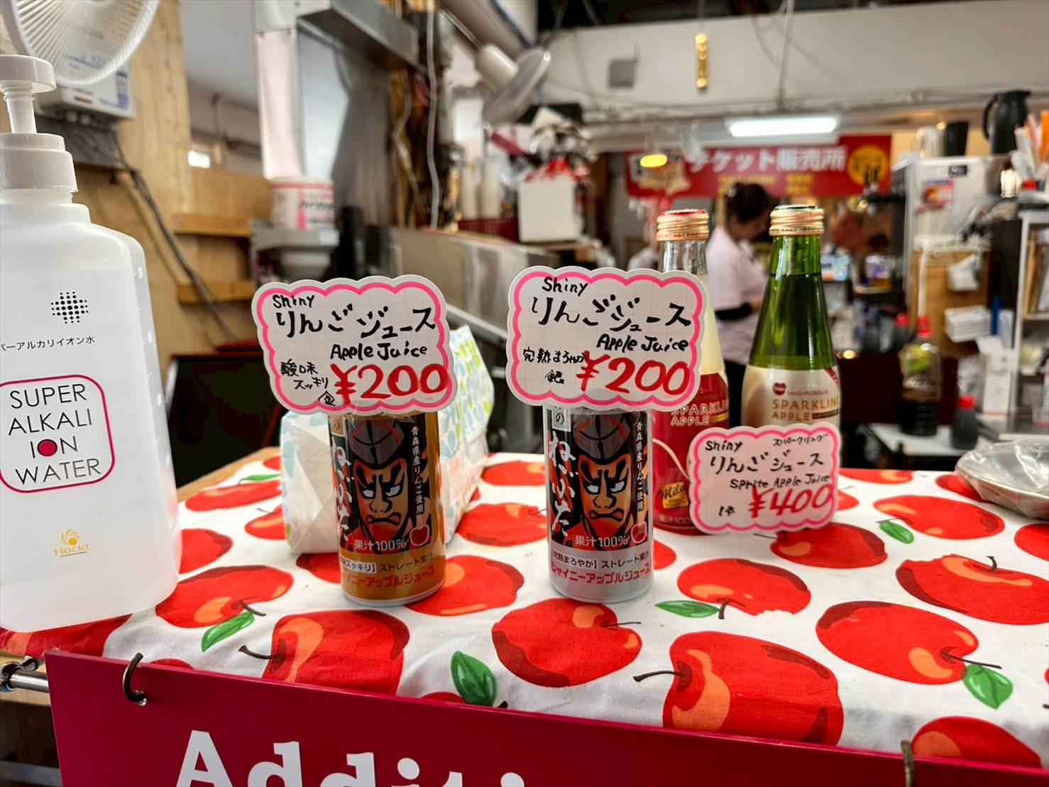 青森らしくリンゴジュースであれば一缶200円、瓶入りの炭酸入りリンゴジュースは400円。