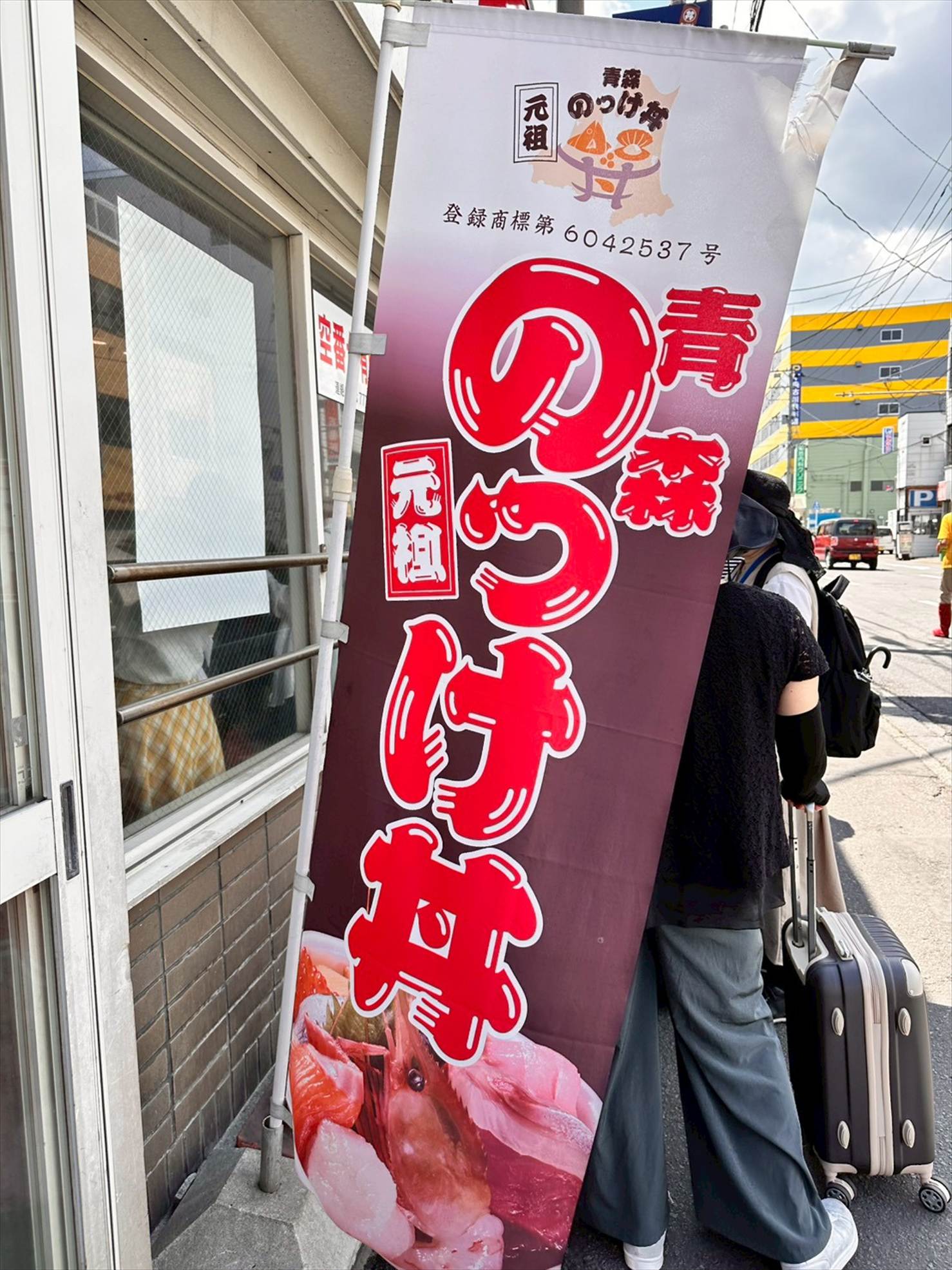 ▲「青森のっけ丼」の大きな幟の前で記念撮影!