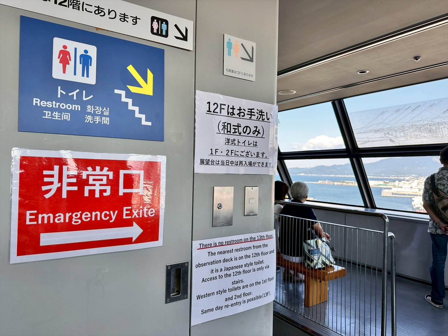 ▲展望台内のトイレは、一階下がった12階に用意されていますが、なんと今どき珍しい和式のみの仕様。