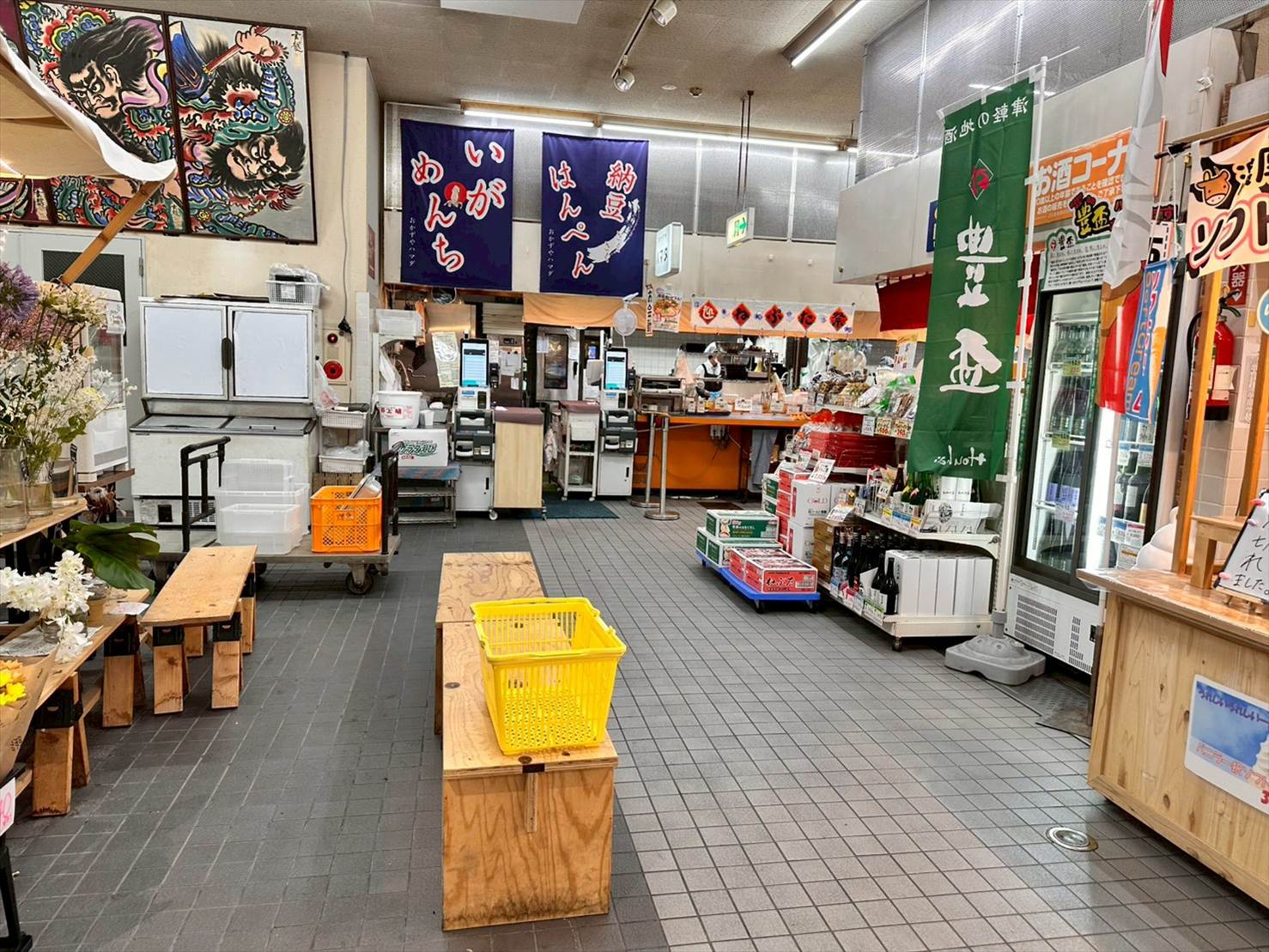 市場内に小さめのイートインスペースが用意されています。ただし席数は多くないため、混雑時は利用しづらいこともあります。近隣ホテルに宿泊している場合は、テイクアウトしてお部屋でゆっくり食べるスタイルもおすすめです。