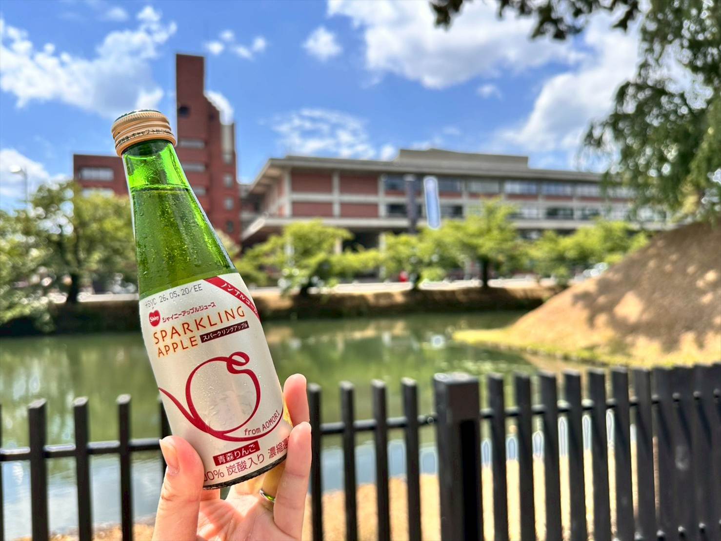 ▲弘前市立観光館で購入したシャイニーアップルジュースの「スパークリングアップル」を片手に、いざ弘前公園へと向かいます!