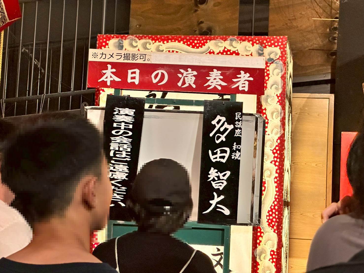 津軽藩ねぷた村では日により様々な演奏者の方が三味線の生演奏を聞かせてくれるようですが、この日は「多田 智大」という方の演奏とのこと。