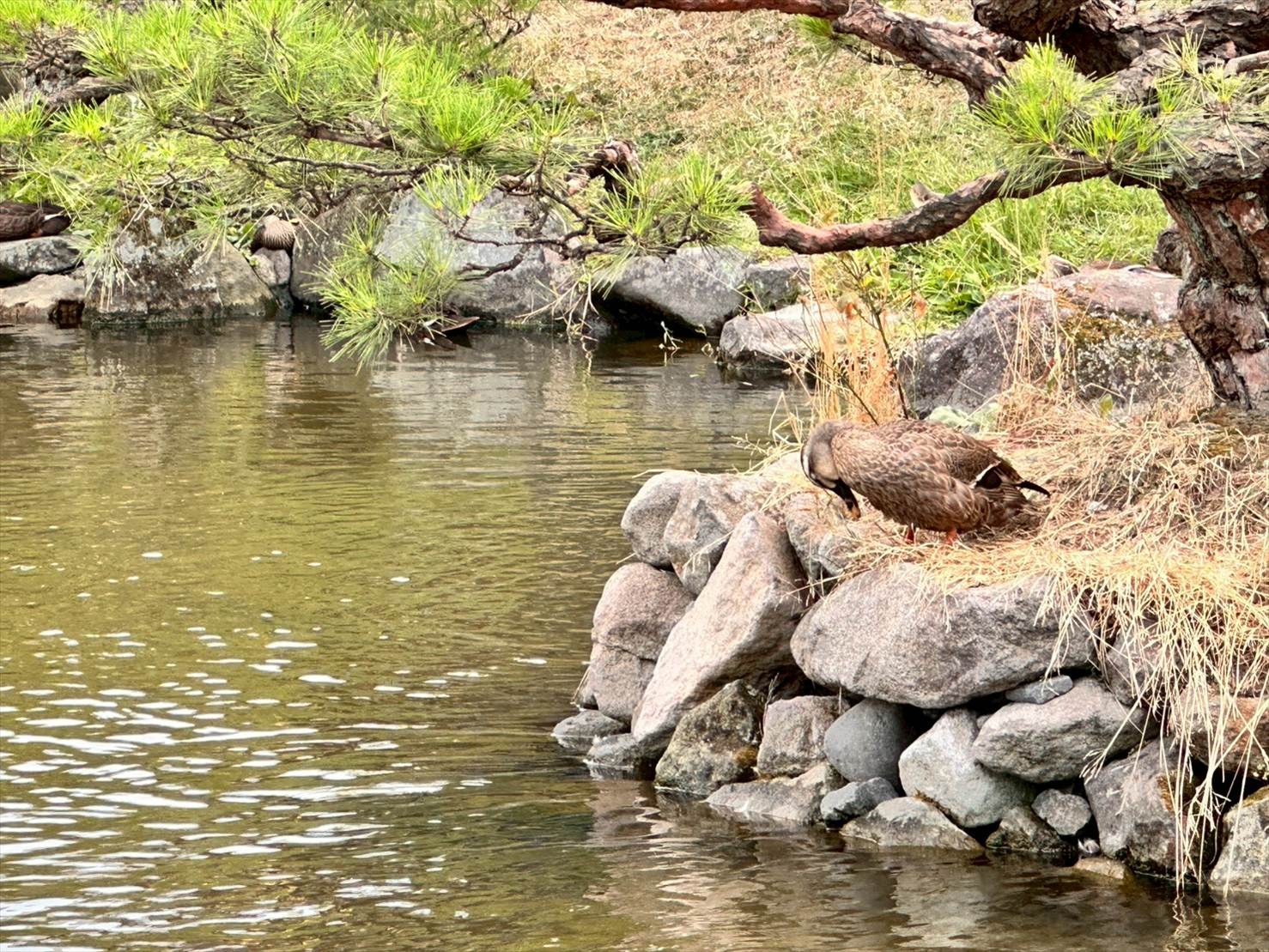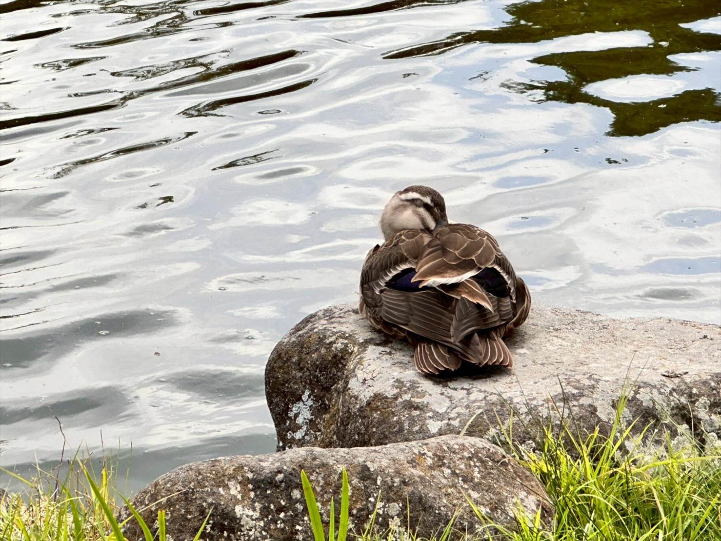 ▲ほぼ目の前の岩場でのんびりくつろいでいるカモもいました。近い。