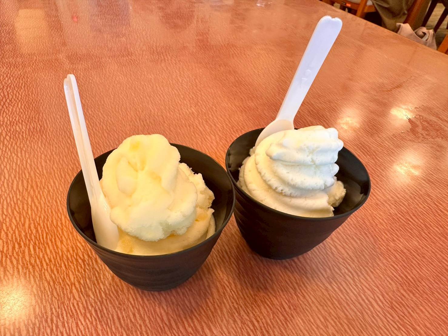 私がりんご味、ぷらはさんが日本酒味です。どちらも美味しいし、何より暑いところを歩き回った後の冷たいものは何にも代えがたい…!最高でした。
